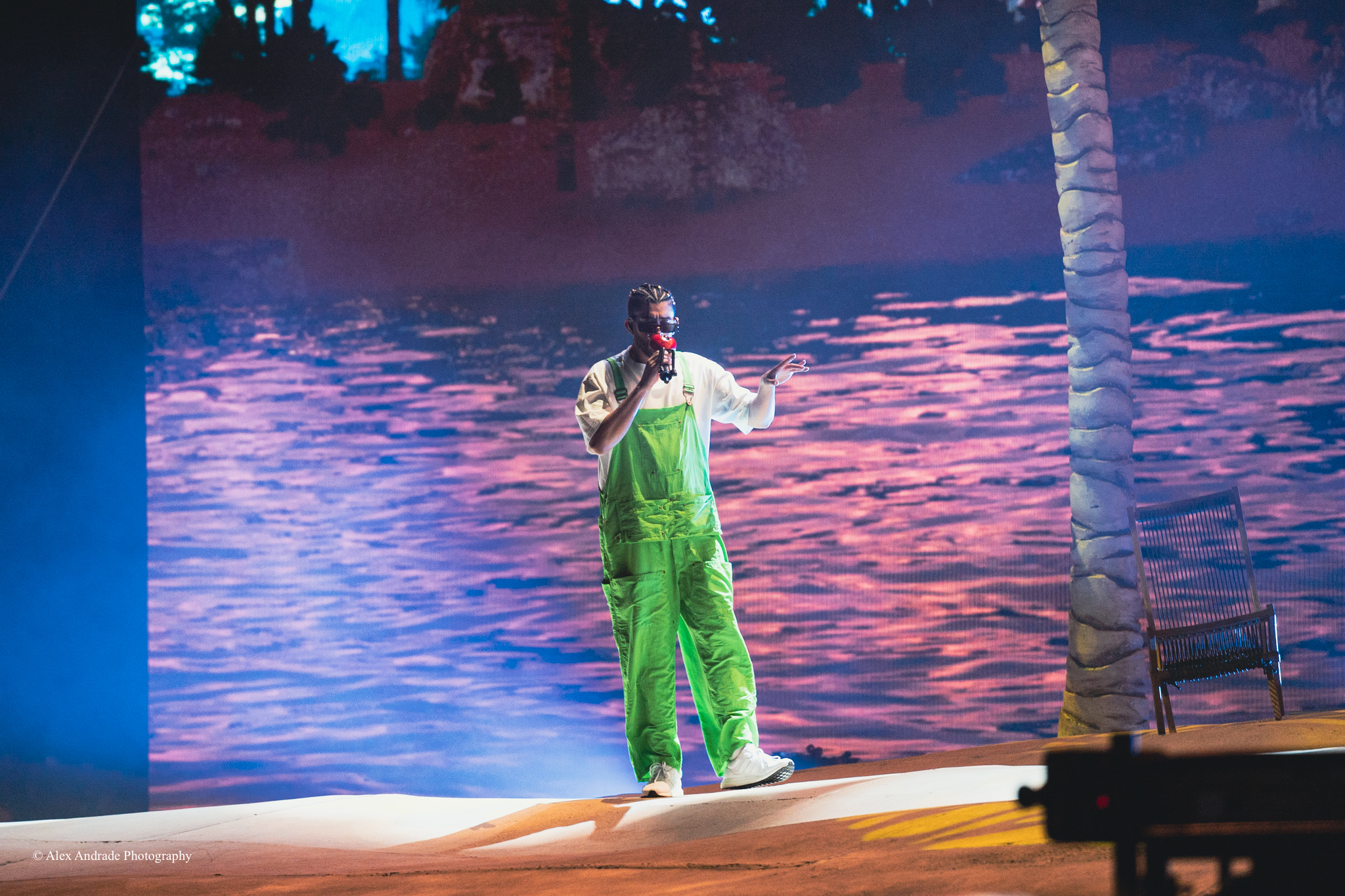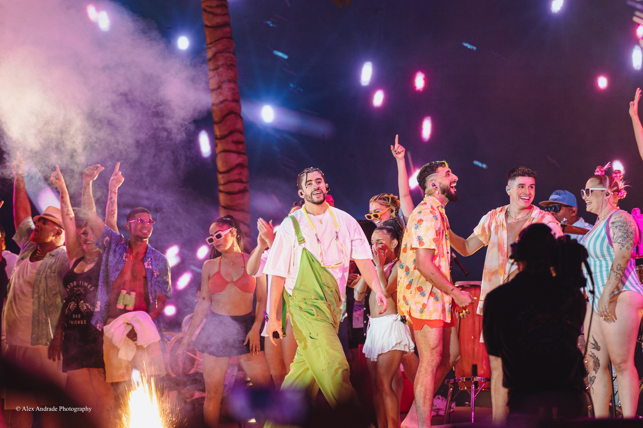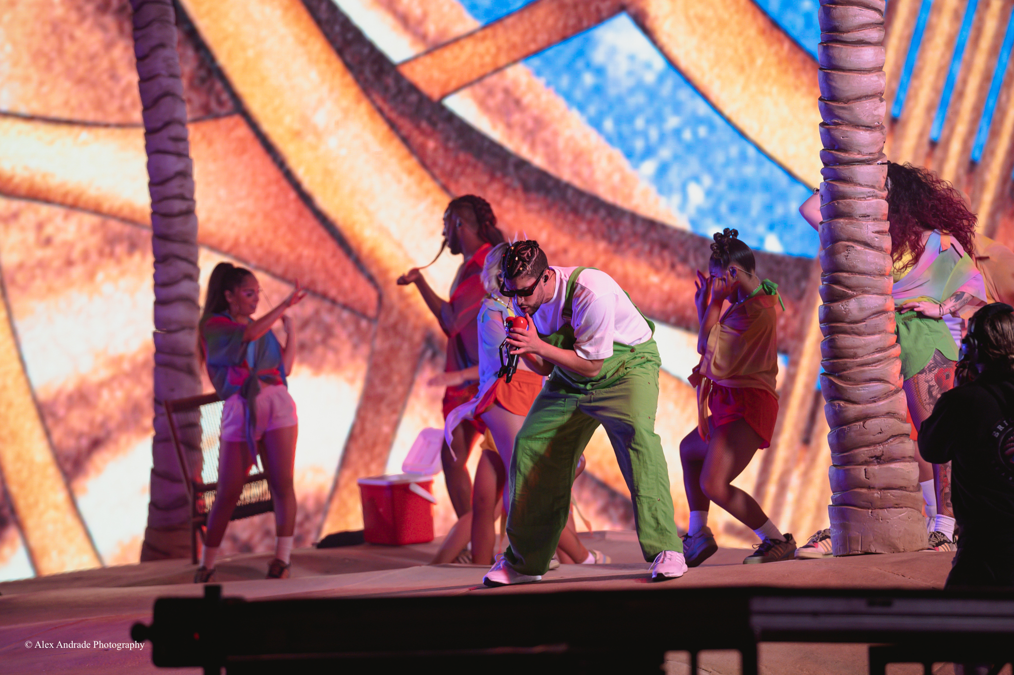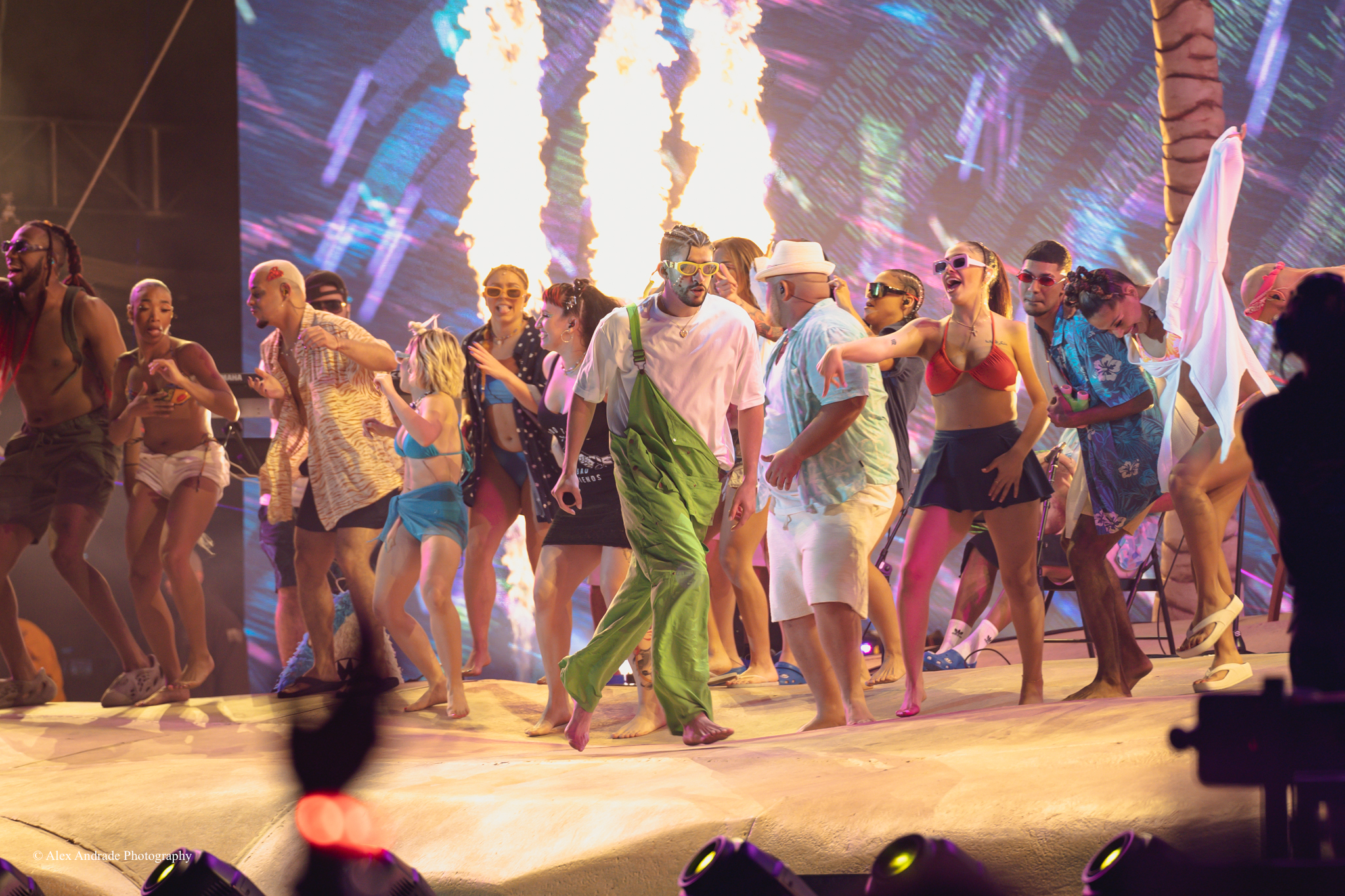 As the crowd grew, fans chanted “Benito! Benito!” in anticipation of the Puerto Rican singer taking the stage. The atmosphere was like a beach party with palm trees and sandy beaches as a backdrop. Bad Bunny, wearing green overalls and a white top, relaxed in a lounge chair, sipping a drink as he started his act.