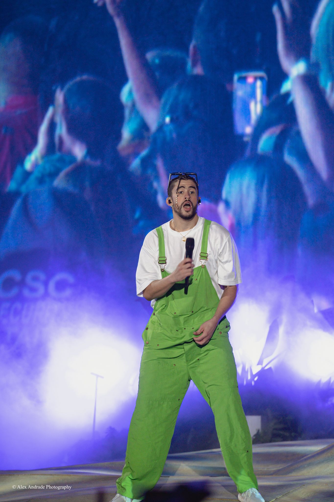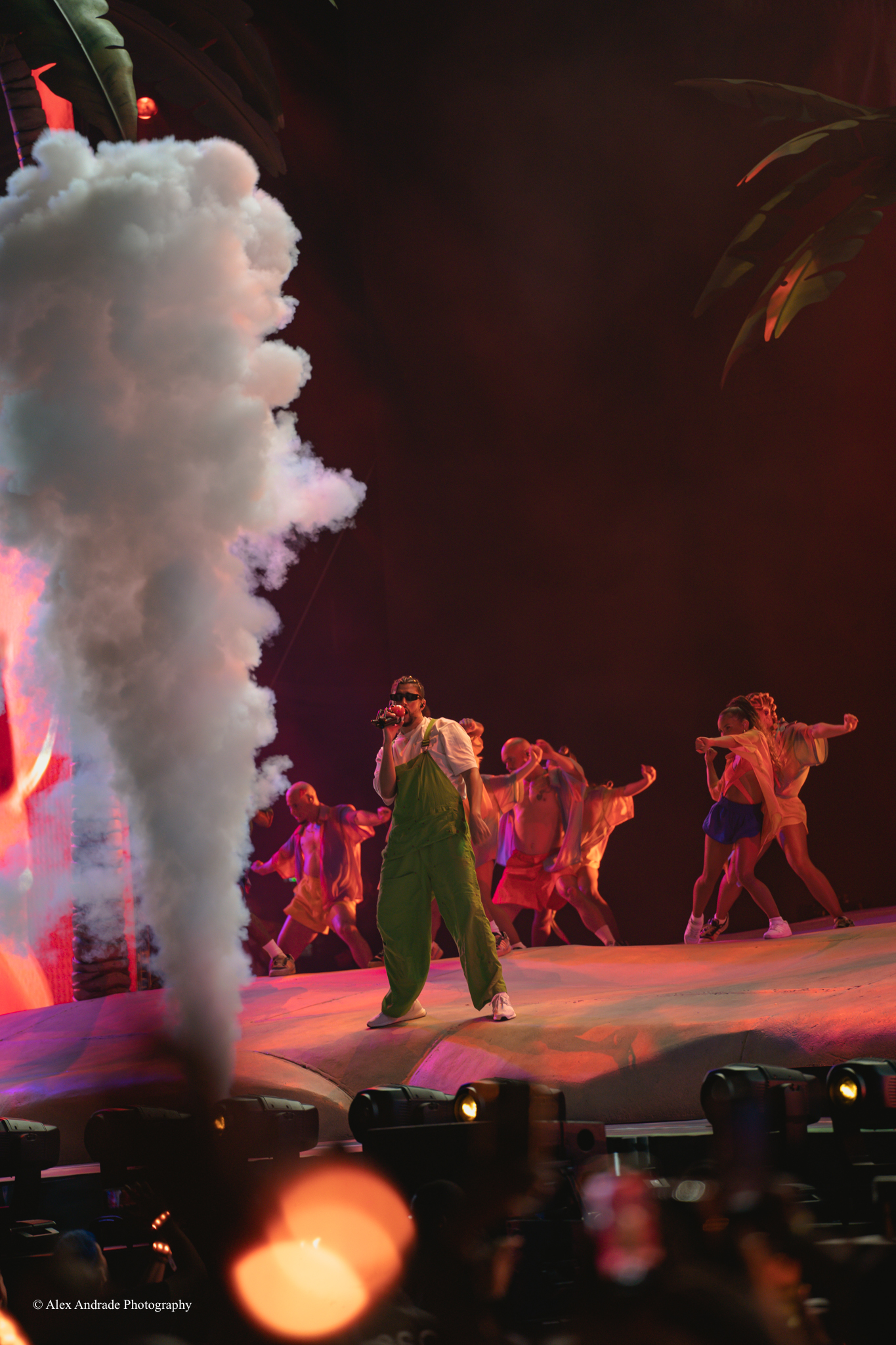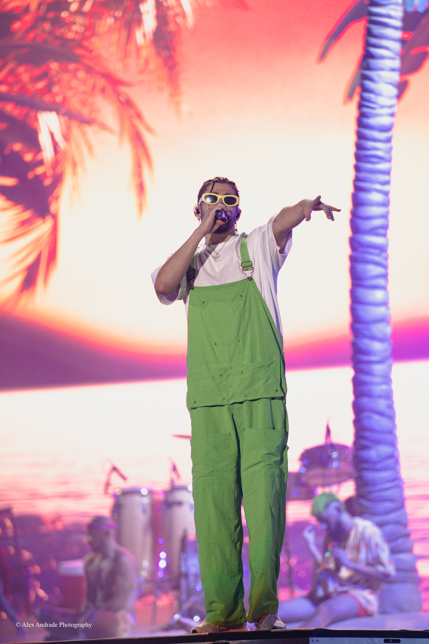 As the crowd grew, fans chanted “Benito! Benito!” in anticipation of the Puerto Rican singer taking the stage. The atmosphere was like a beach party with palm trees and sandy beaches as a backdrop. Bad Bunny, wearing green overalls and a white top, relaxed in a lounge chair, sipping a drink as he started his act.