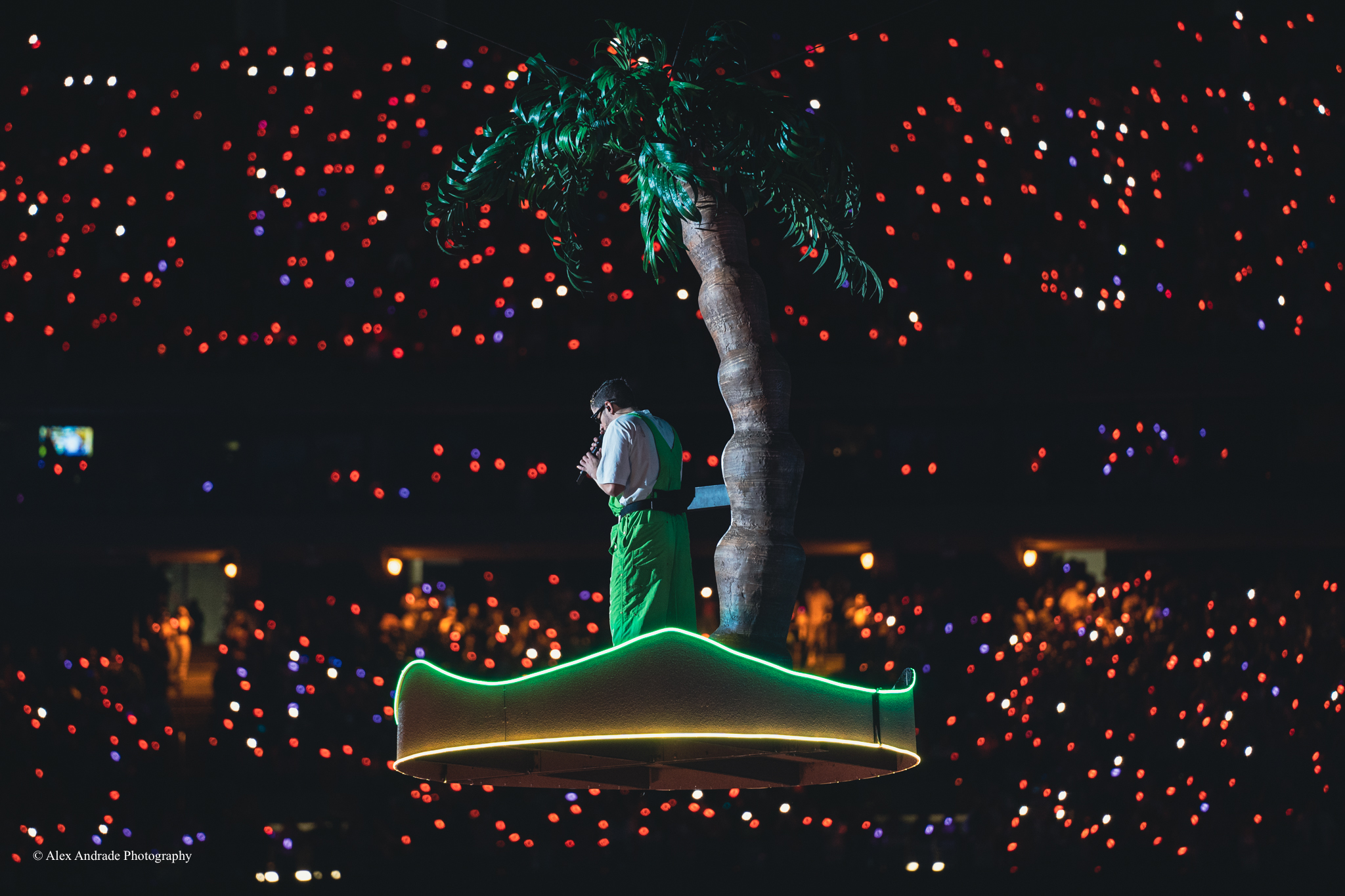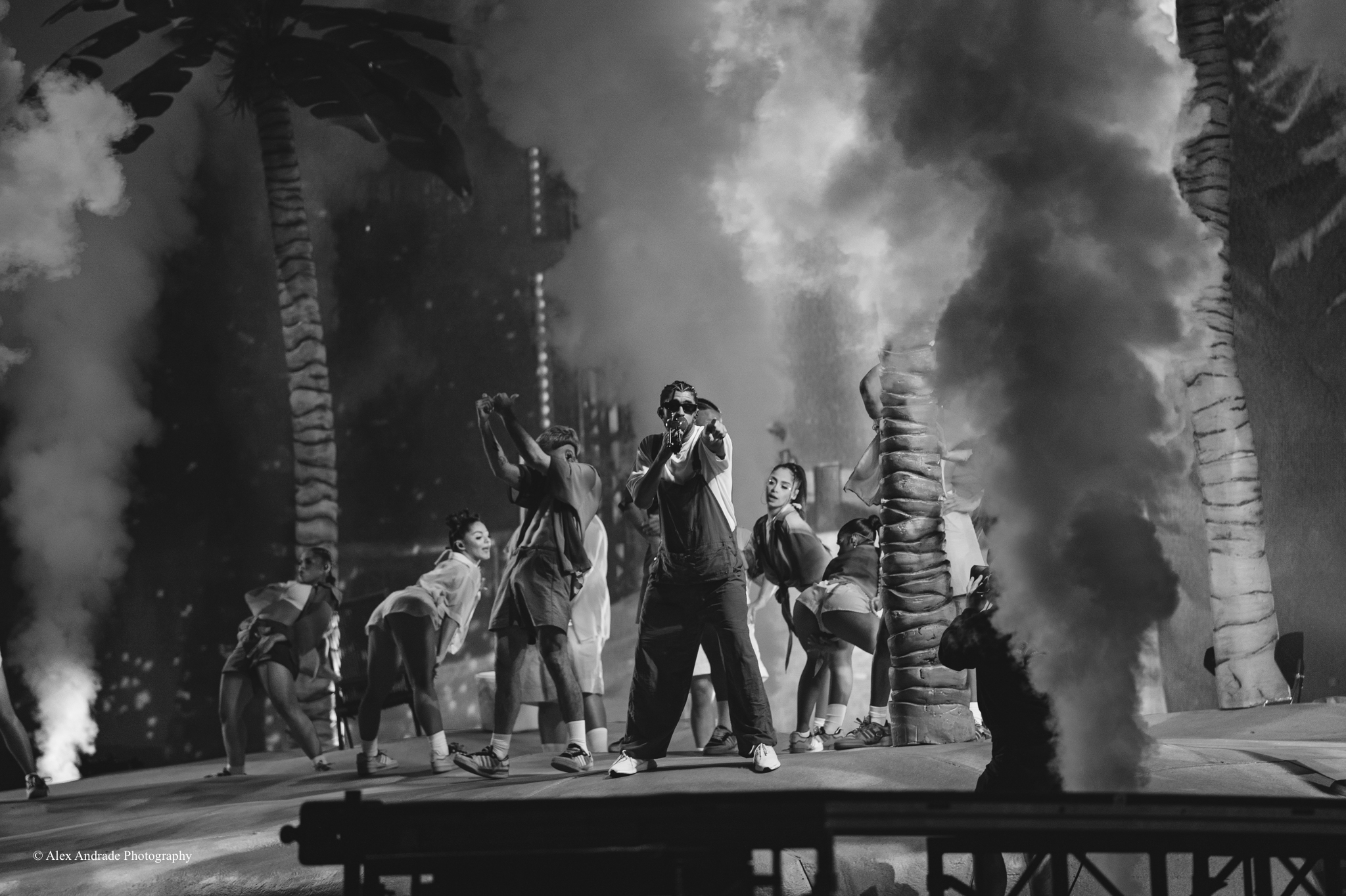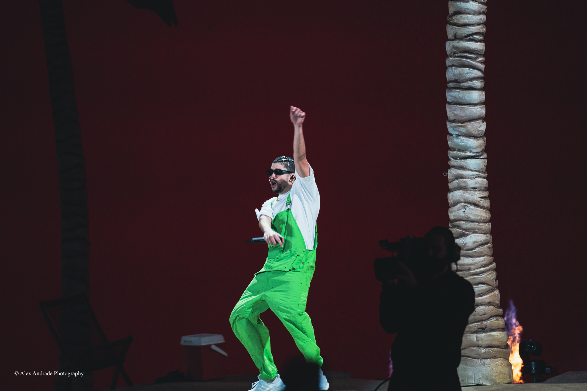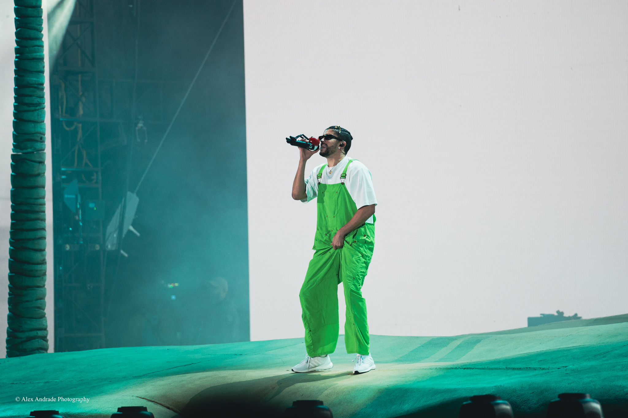 As the crowd grew, fans chanted “Benito! Benito!” in anticipation of the Puerto Rican singer taking the stage. The atmosphere was like a beach party with palm trees and sandy beaches as a backdrop. Bad Bunny, wearing green overalls and a white top, relaxed in a lounge chair, sipping a drink as he started his act.