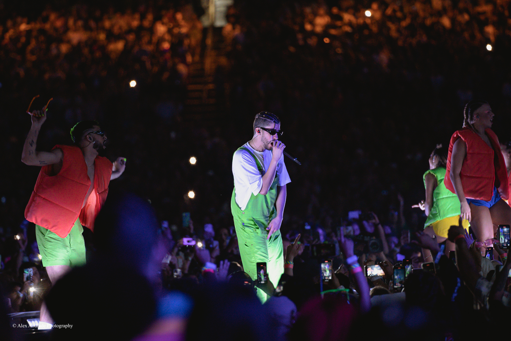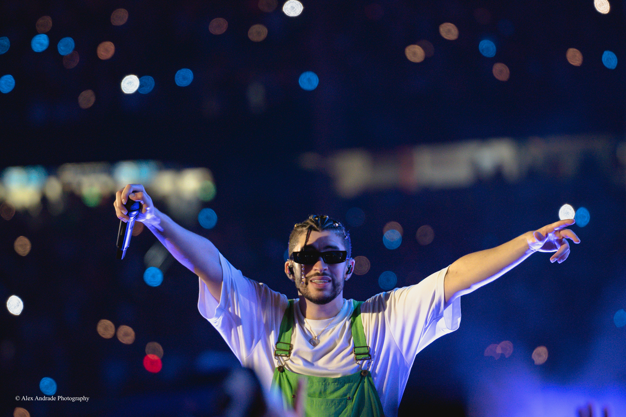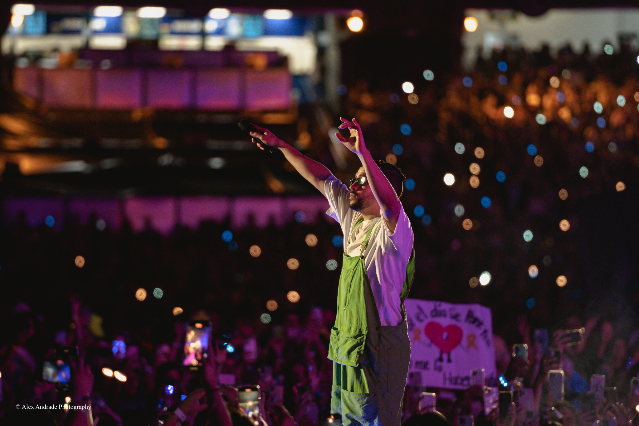 Bad Bunny raced through his setlist, playing full or partial versions of his songs and keeping up with the energy level of the crowd. Fireworks, jets of flames, and laser light shows added to the excitement.
