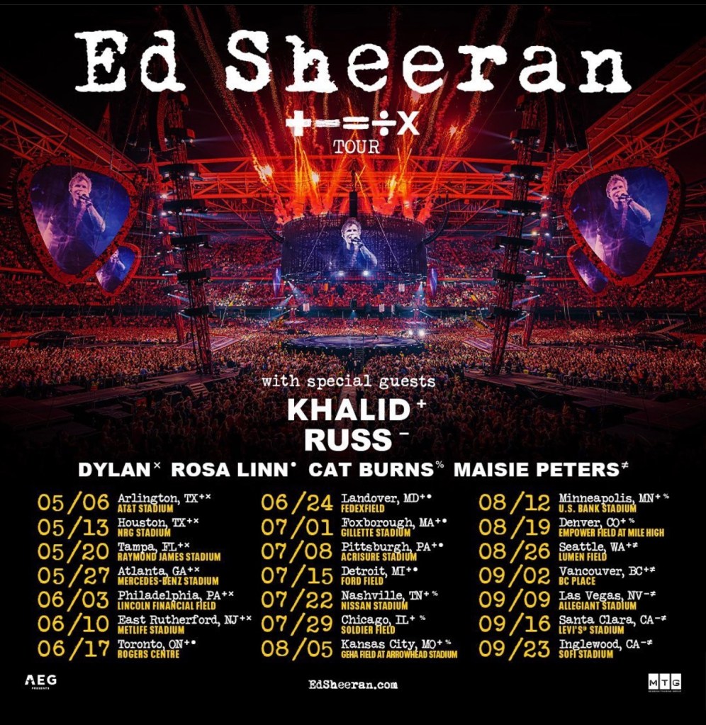 Recently, Ed Sheeran took to Instagram and posted on his story a photo of a list of cities for his upcoming ‘Mathematics Tour’ in 2023. Ed Sheeran will feature a rotating lineup support act from artists Russ, Khalid, Ross Linn, Cat Burns, Dylan, and Maisie Peters. The tour will start on May 6th, 2023 in Arlington, TX and will end on September 23rd, 2023 in Los Angeles, CA at SoFi stadium. Northern California will get a date in the Bay Area at Levi Stadium on September 16, 2023. He’ll perform at 21 venues across North America.