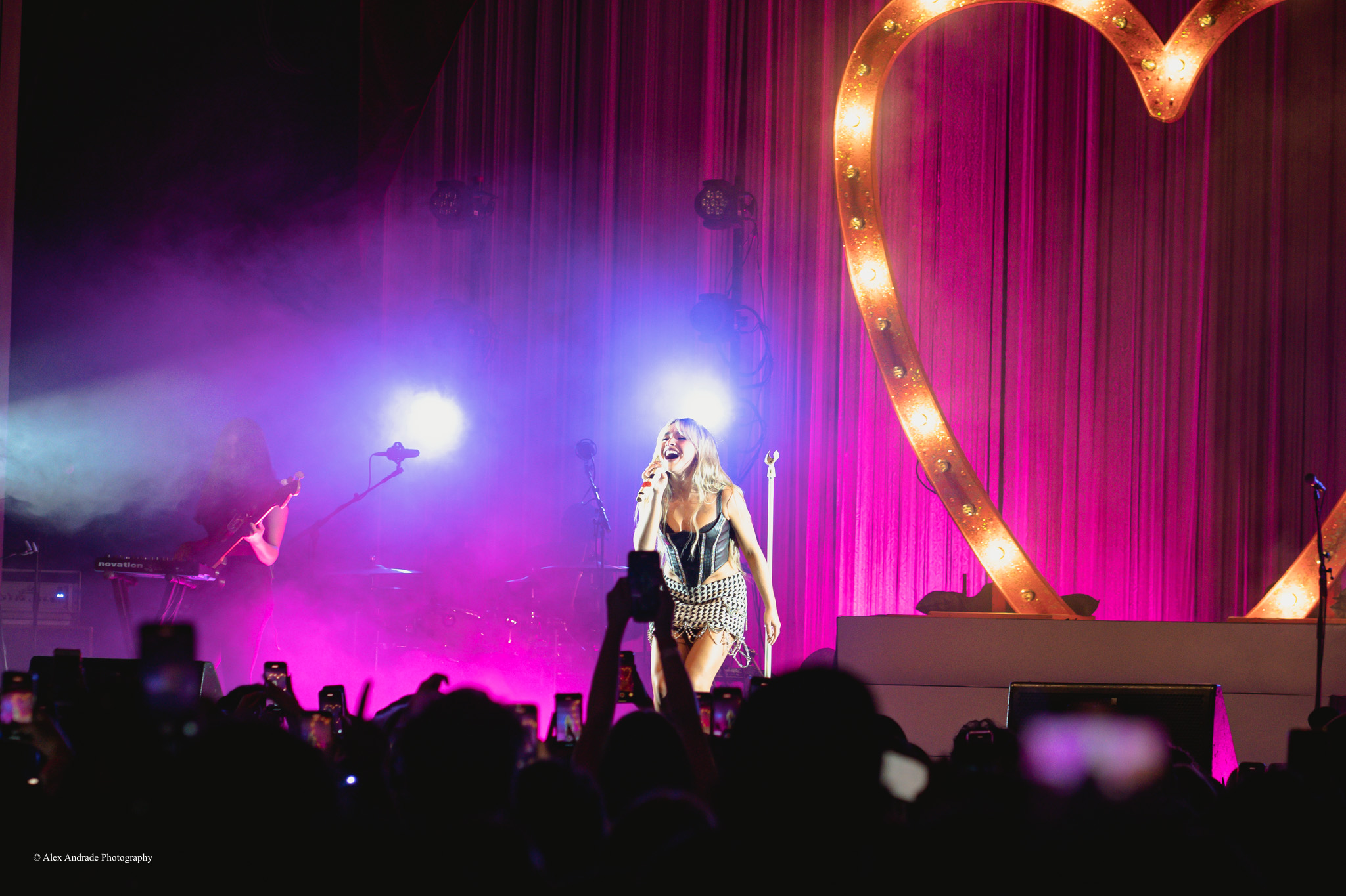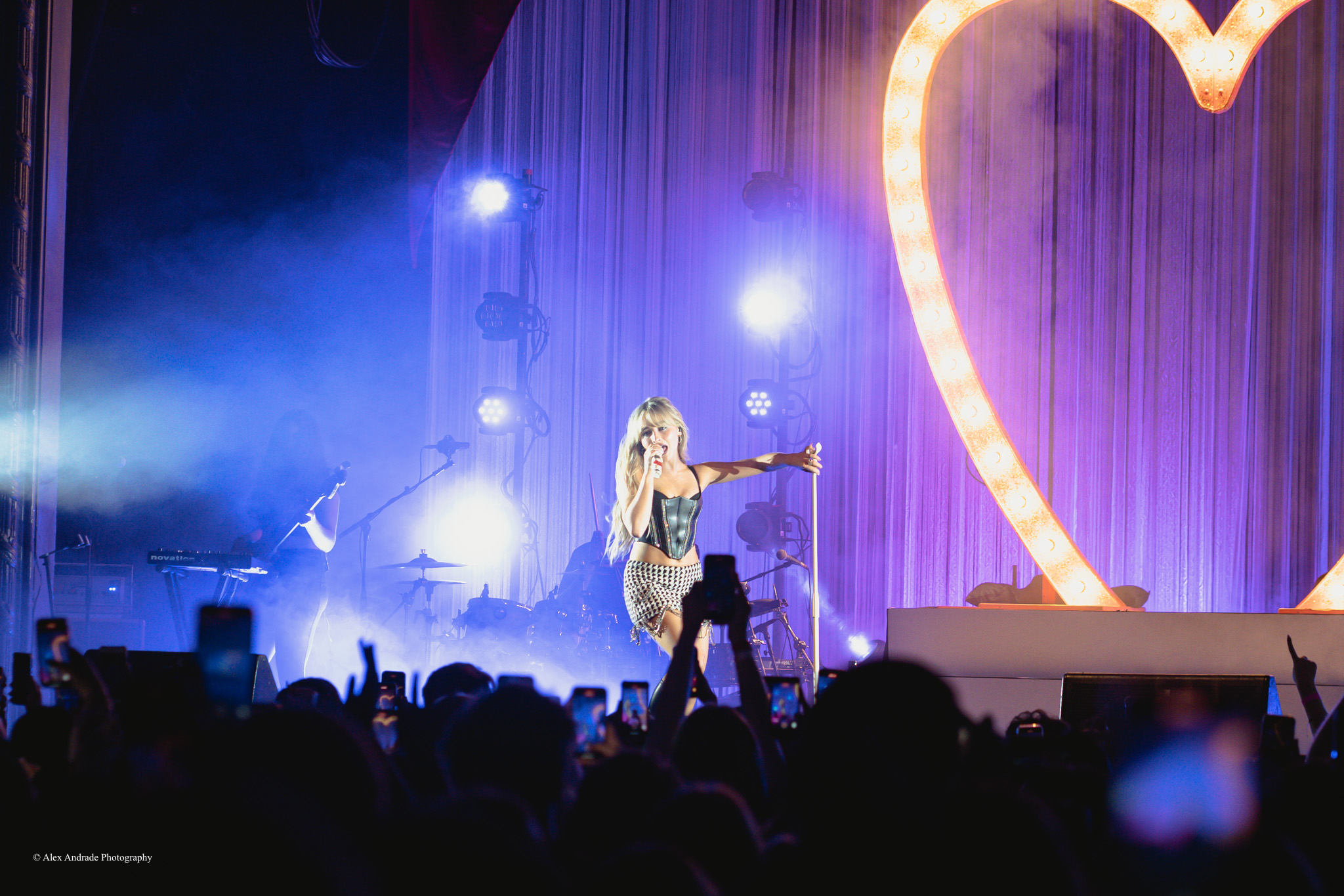 The show began with such a passionate and emotional moment as Sabrina Carpenter sang to the title track of her most recent album, “Emails I Can’t Send” playing on a keyboard as the crowd patiently waited for her to hit the stage. She began to play the piano that was center of the stage in front of a large prop that was shaped as a heart with lights filling it.