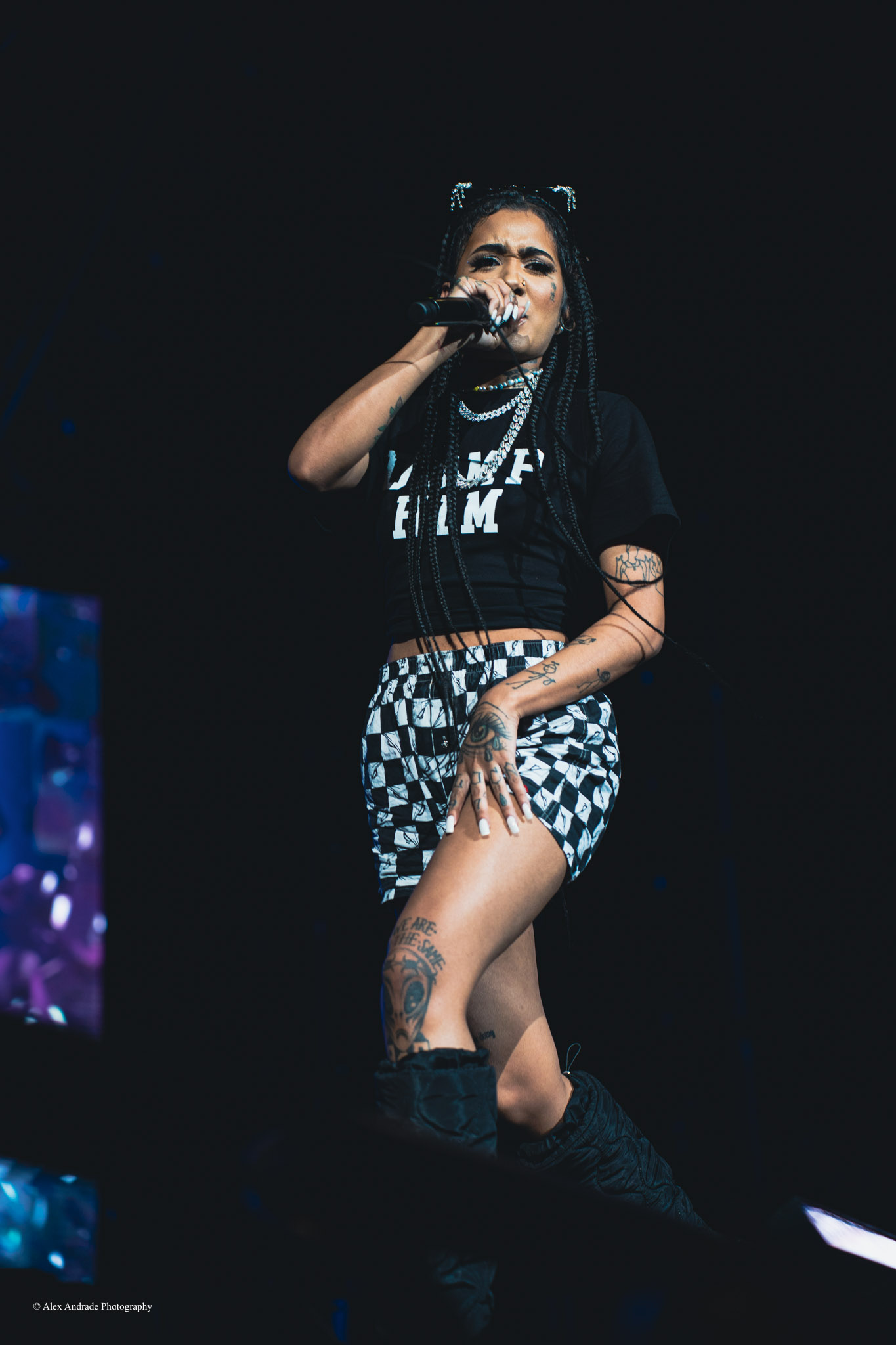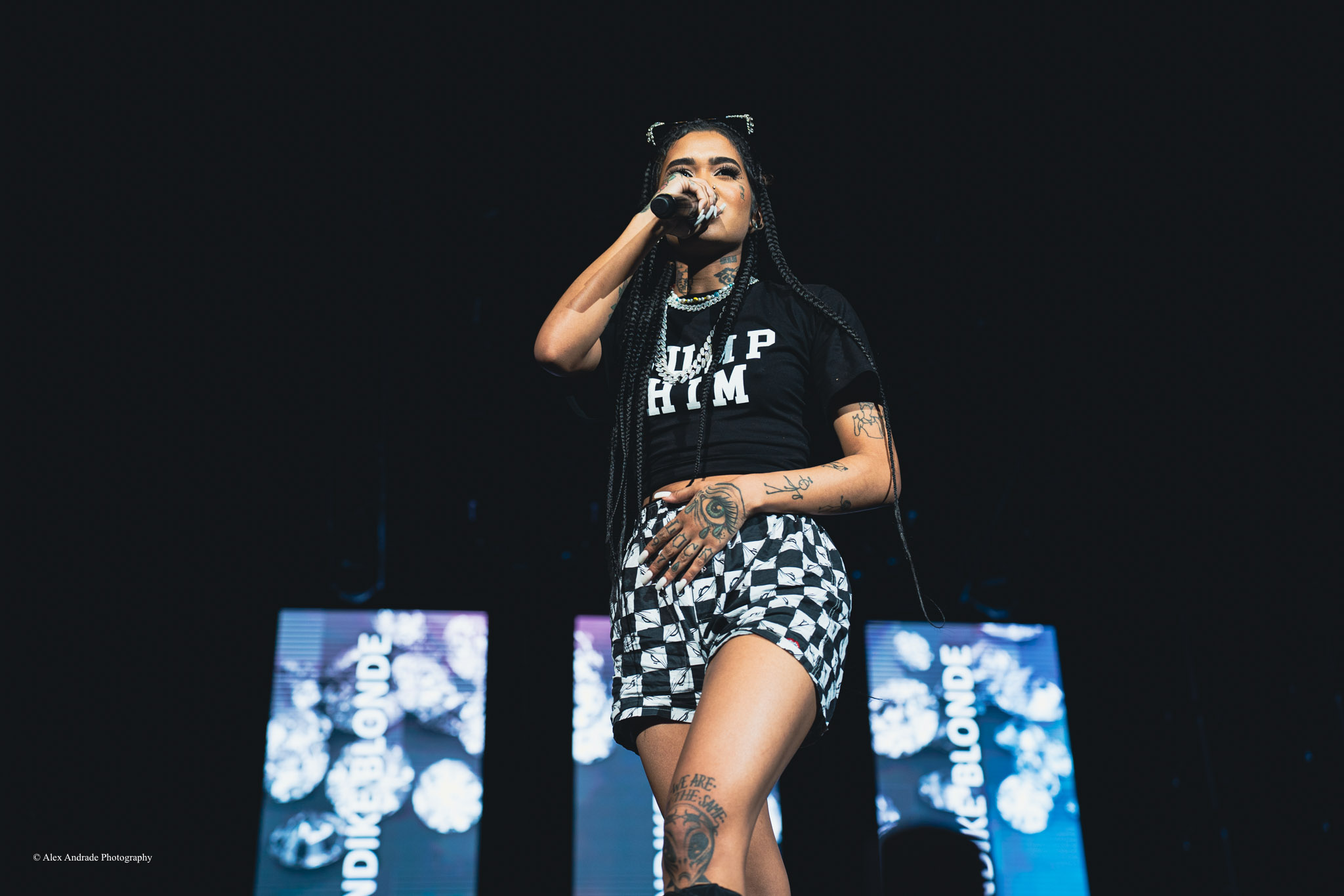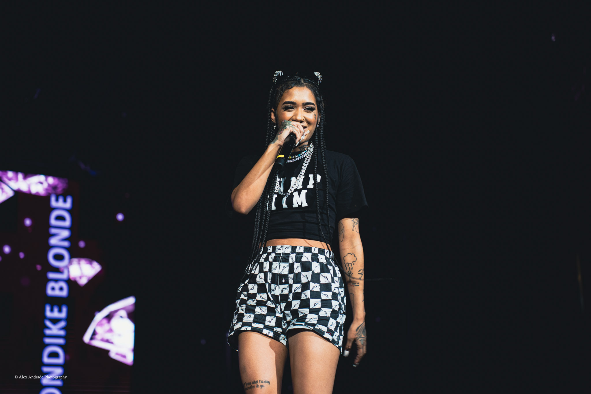 Around 7 PM, rapper Klondlike Blonde took the stage and performed hit singles “Drip,” “No Smoke” and “Put It On Me.” Klondike Blonde wore a black tee with checkered shorts and black boots. She danced and interacted with the audience, pointing at and vibing with them as she rapped in each section in front of her.