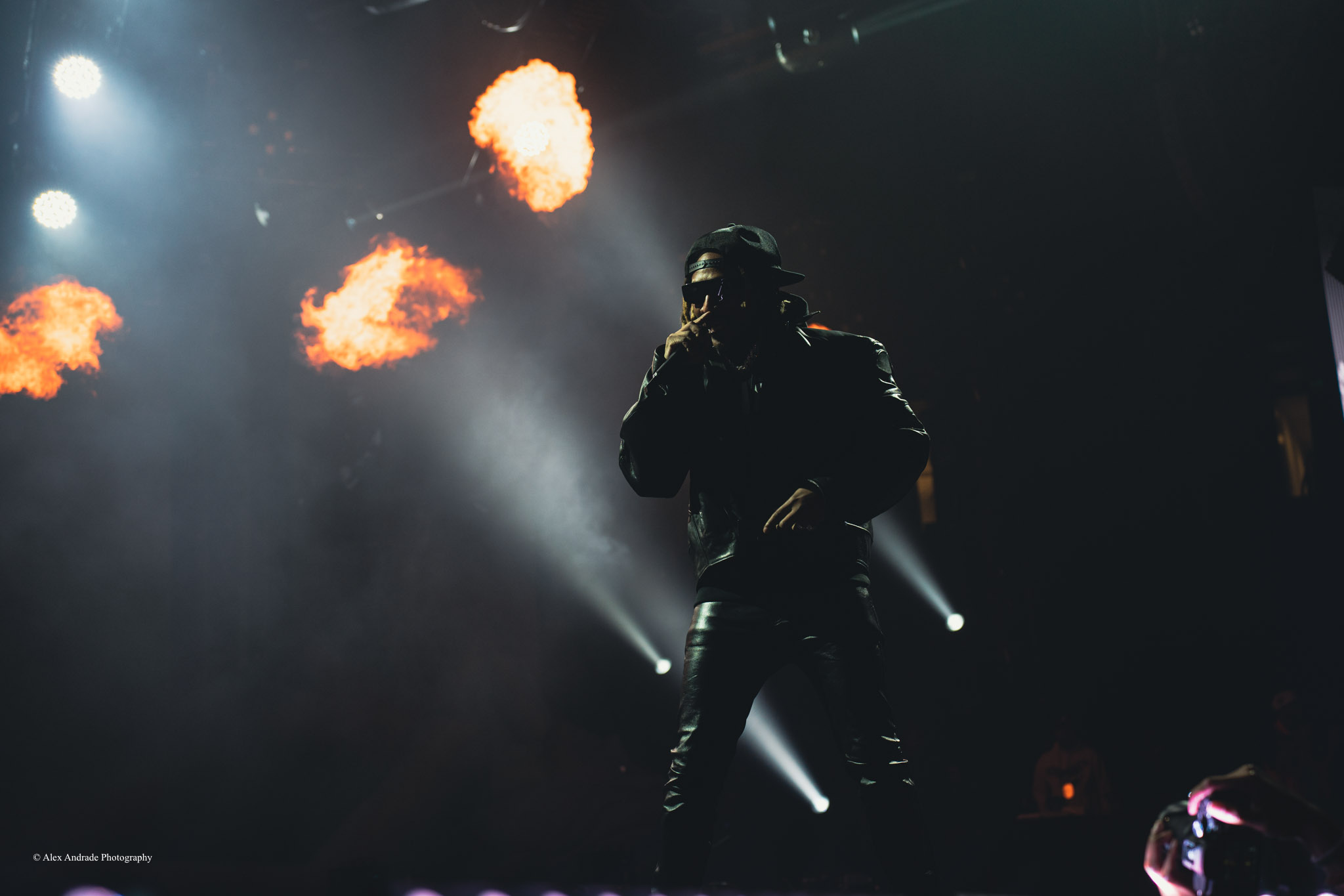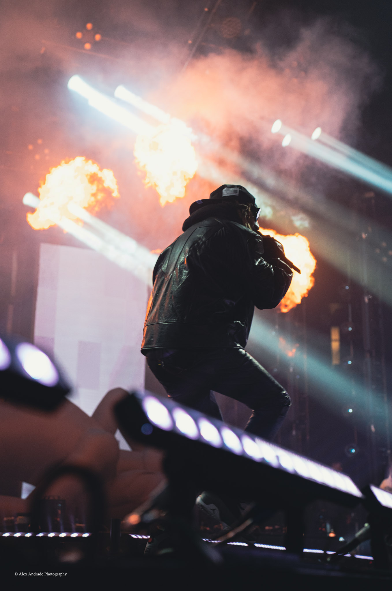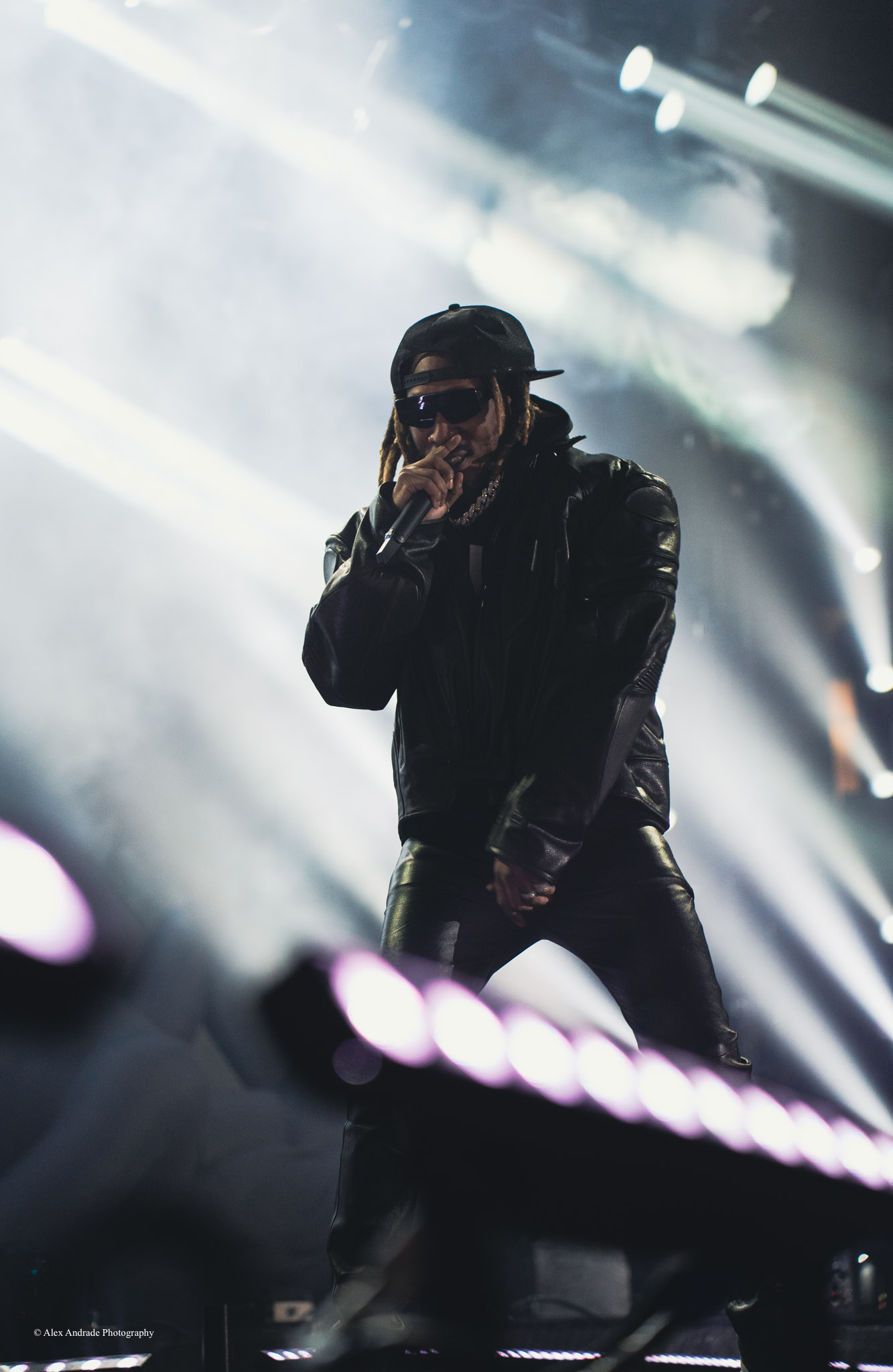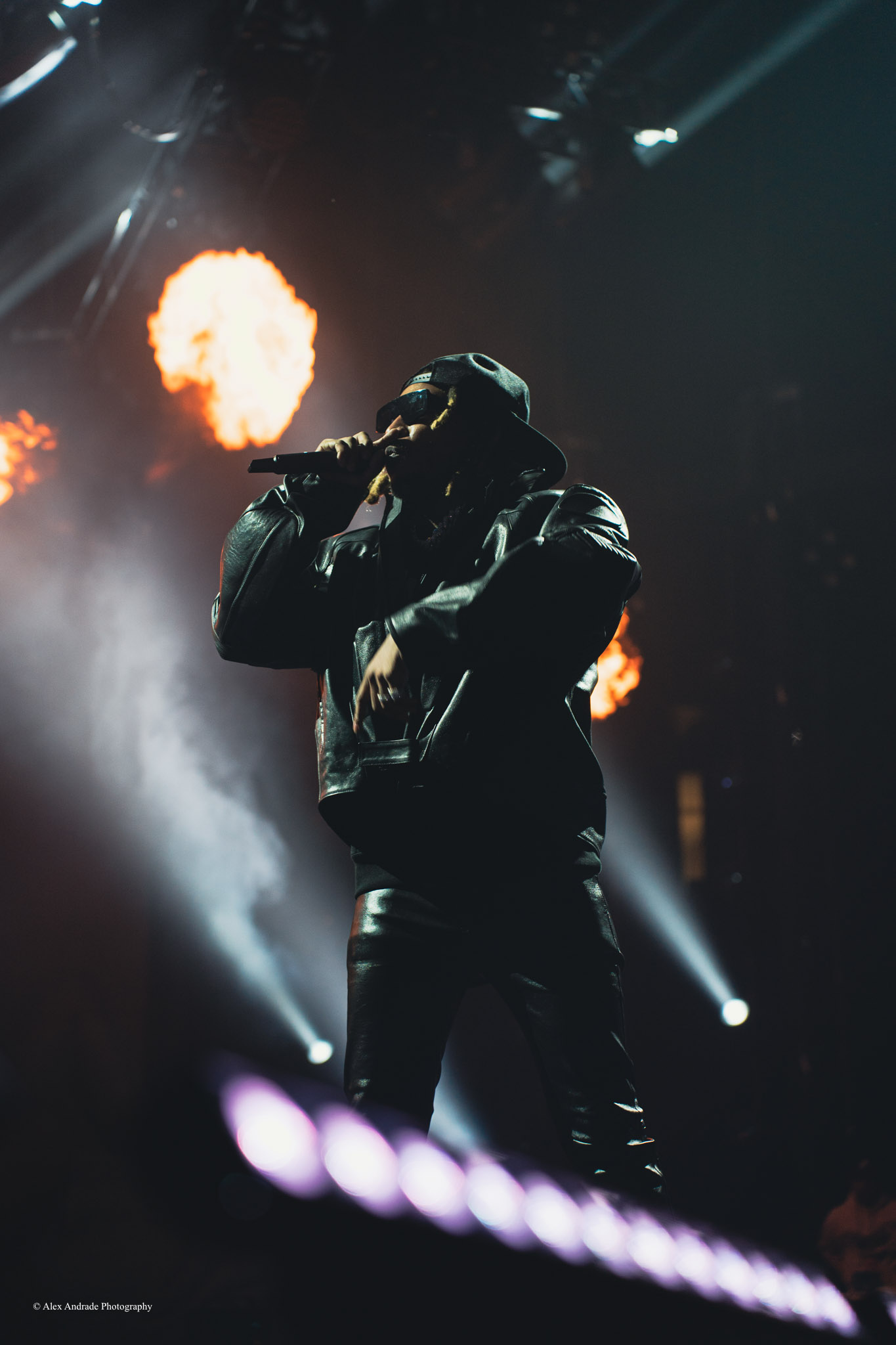 The anticipation built as a black sheer sheet dropped in front of the stage, building suspense. Flames shot up, and smoke introduced Future, who wore an all-black outfit with a jacket that says “Oakland, Ca” and leather jeans. A big figure sculptured woman was in the background as he hit the stage, setting it on fire with his unique style and energy. The artist performed over 40 songs, including his early mixtape hits as well as newer material.