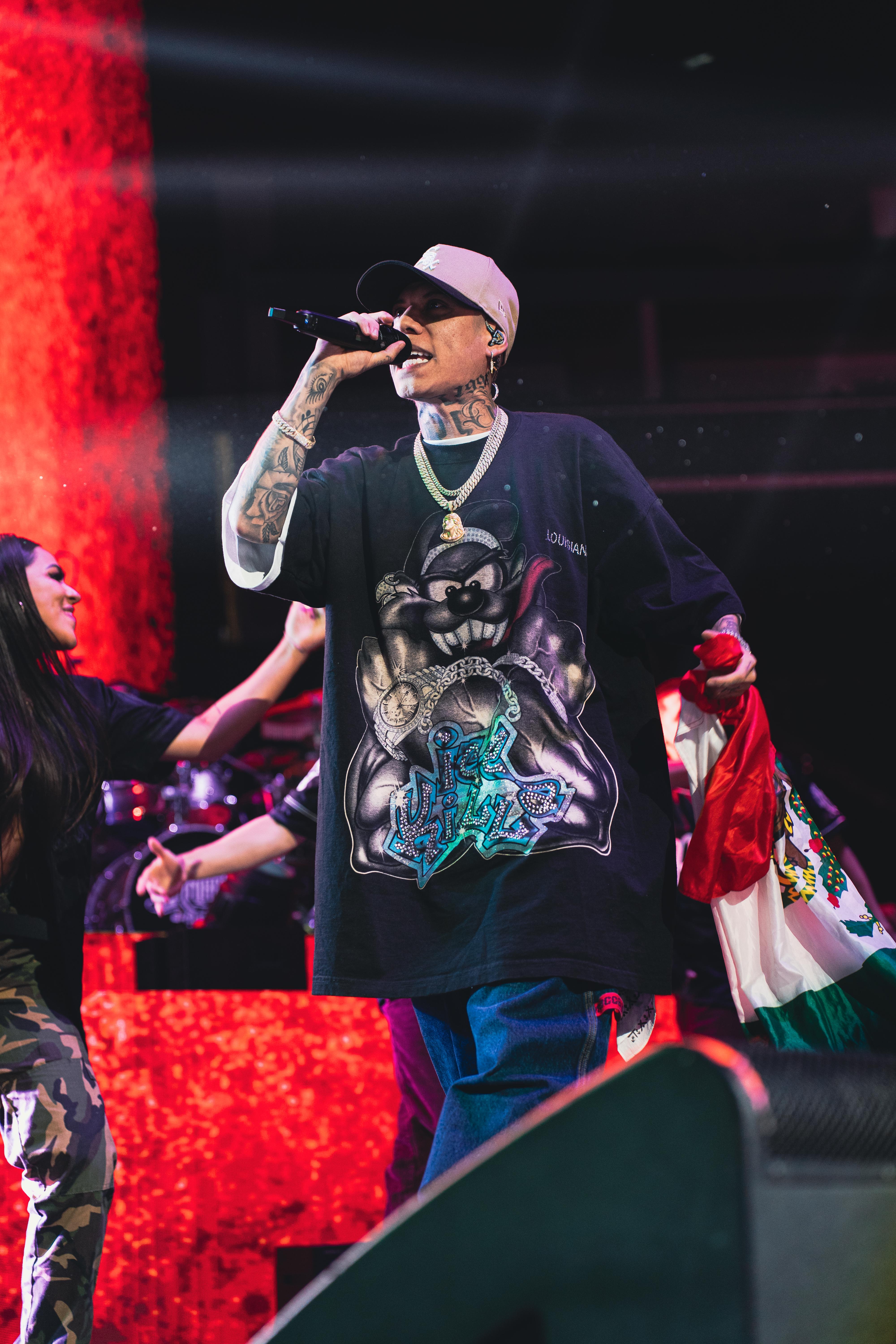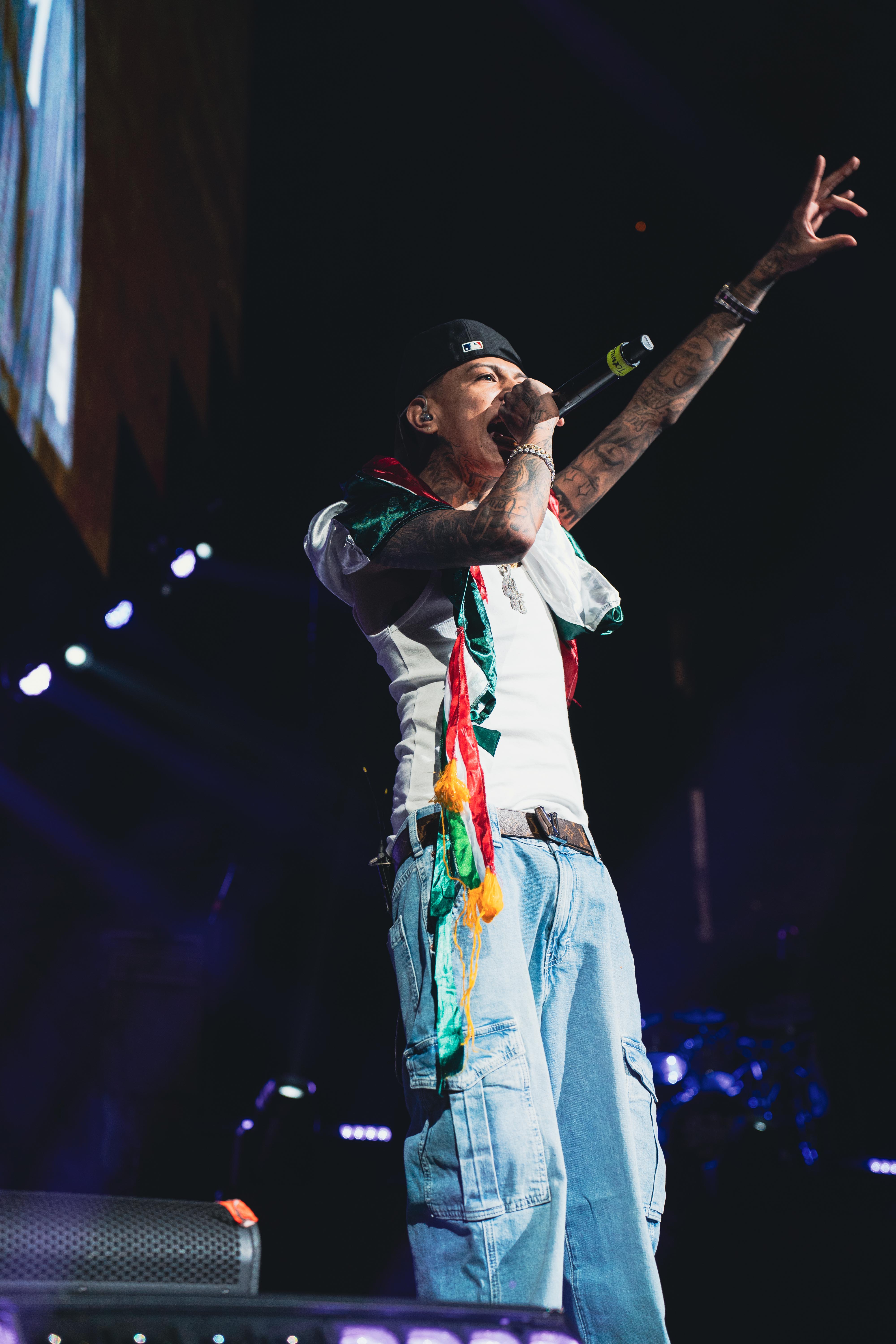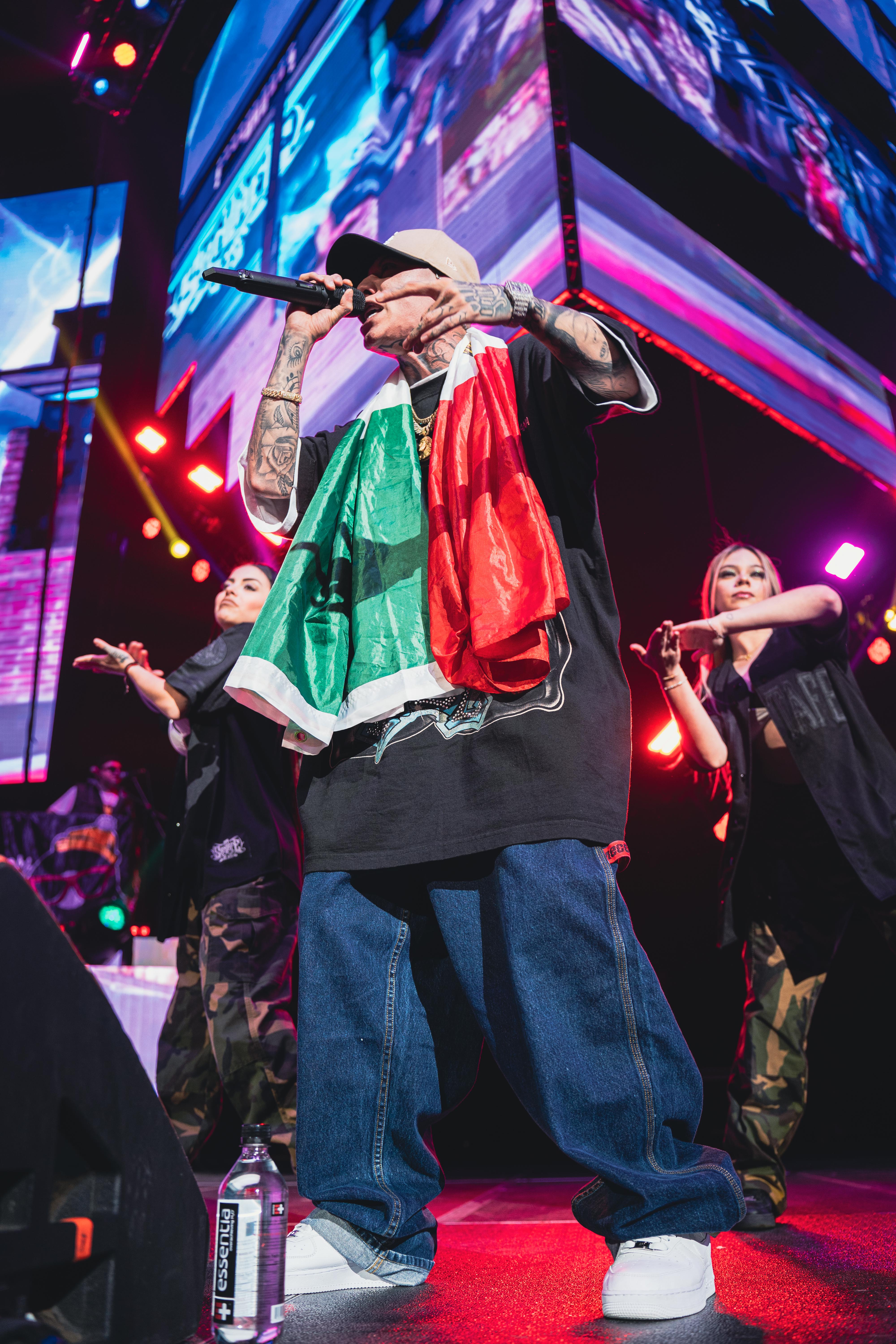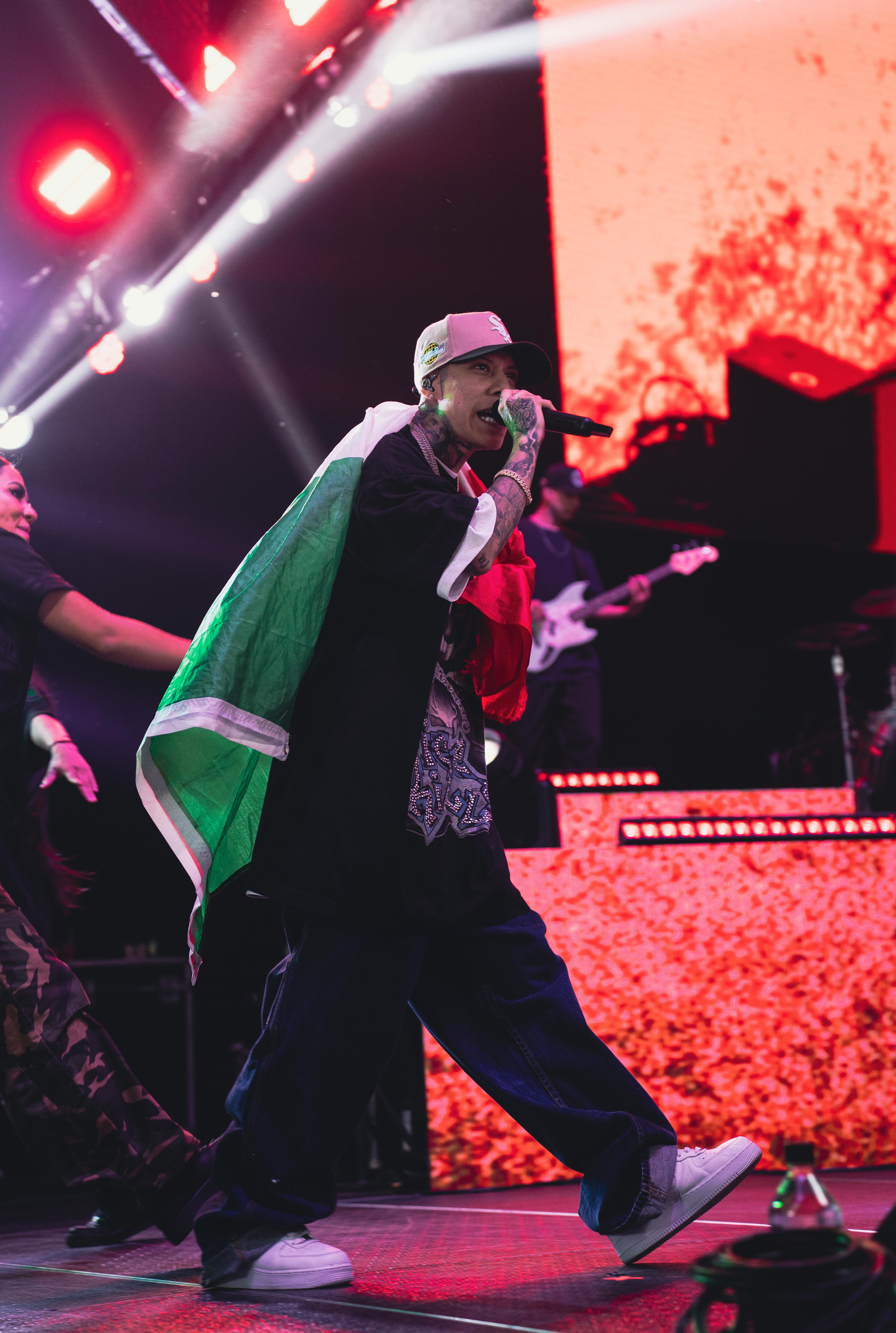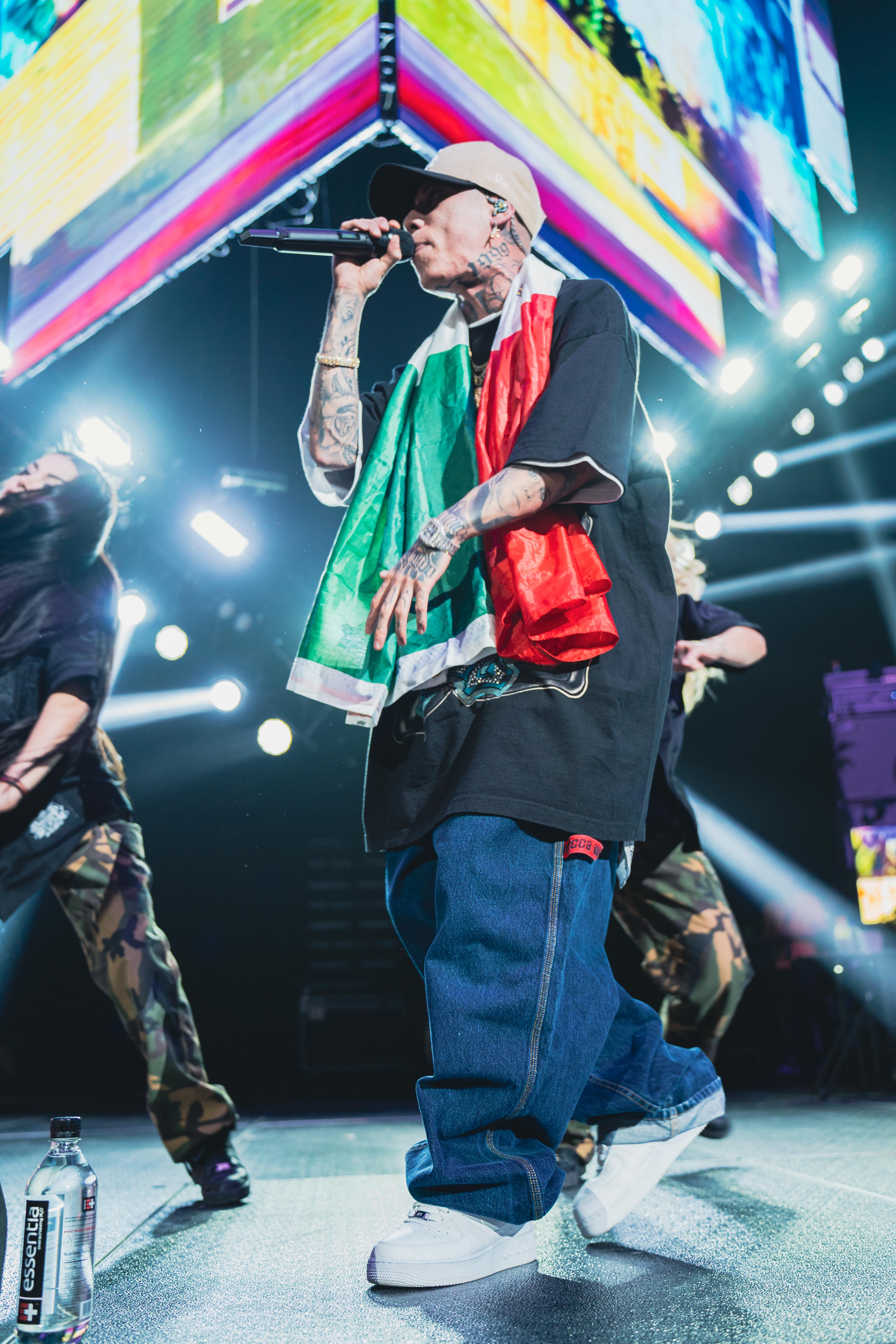 As the clock ticked to 9:10pm, anticipation soared with a larger-than-life image of Santa Fe Klan illuminating the screen, accompanied by a countdown. The crowd’s roar reached a crescendo, and at 9:15pm, the venue plunged into darkness before a teaser clip ignited the senses. A couple of figures emerged on stage, cradling the Mexico flag, making way for Santa Fe Klan’s grand entrance. Draped in the flag, he emerged with unwavering pride, while dancers illuminated the center stage.