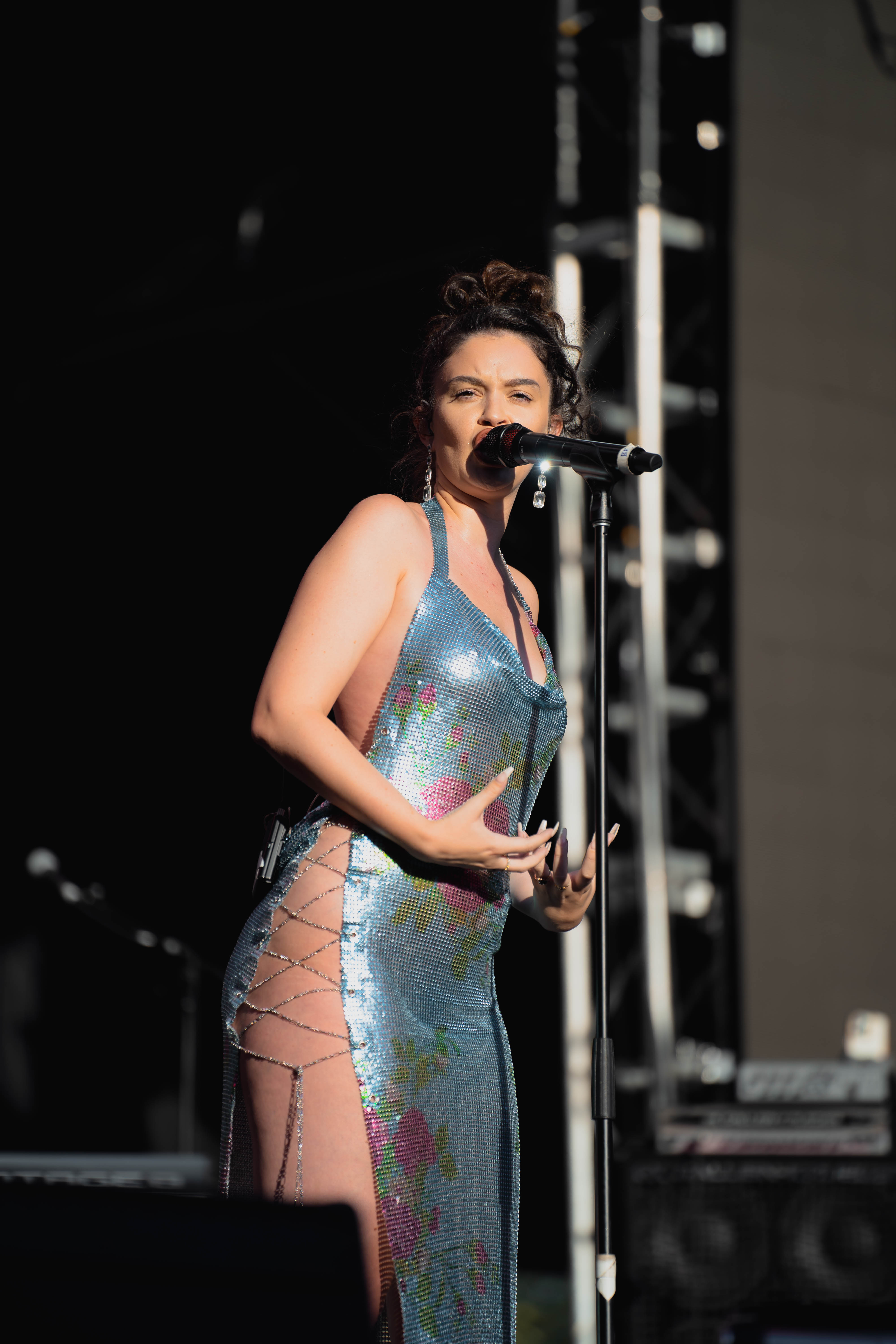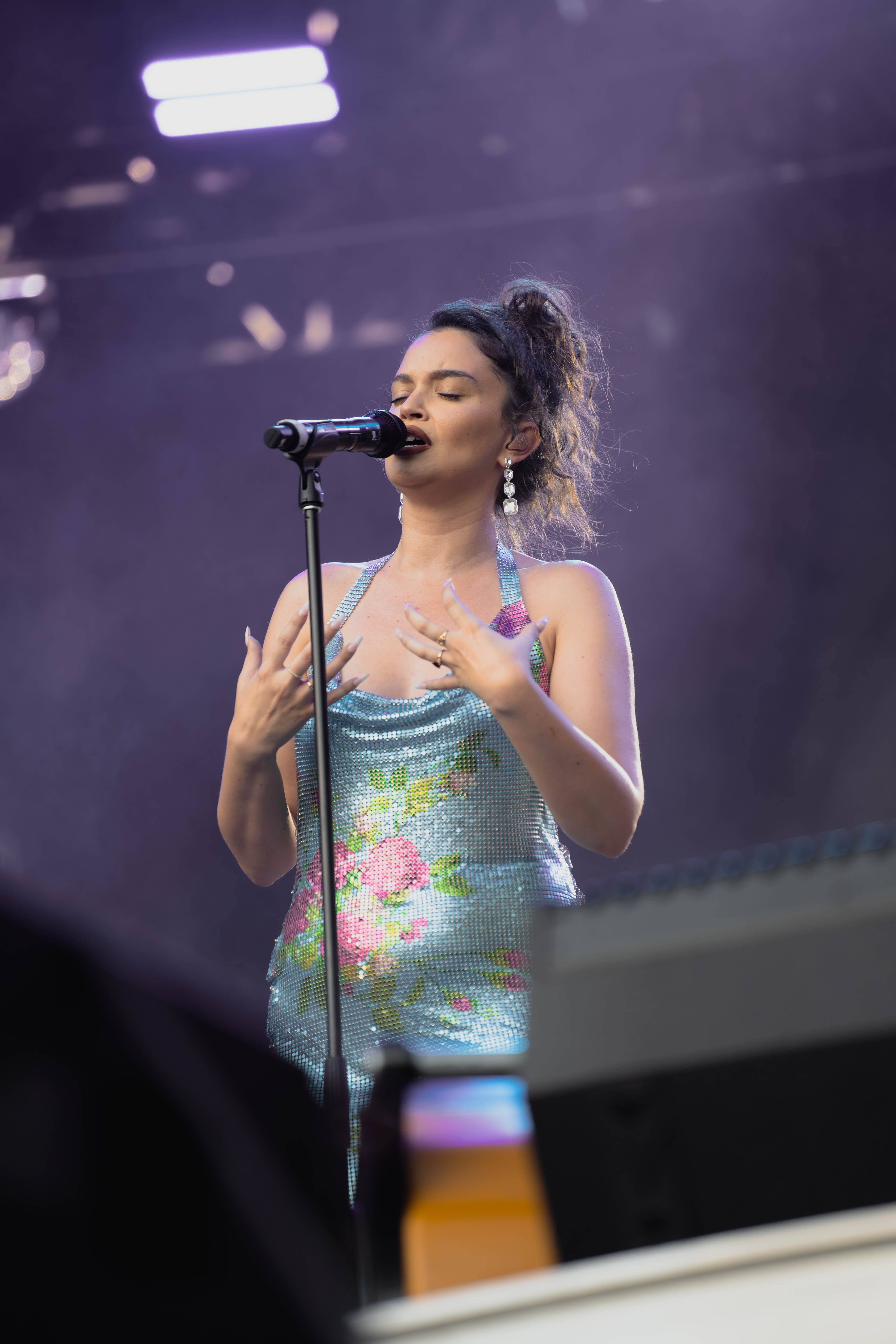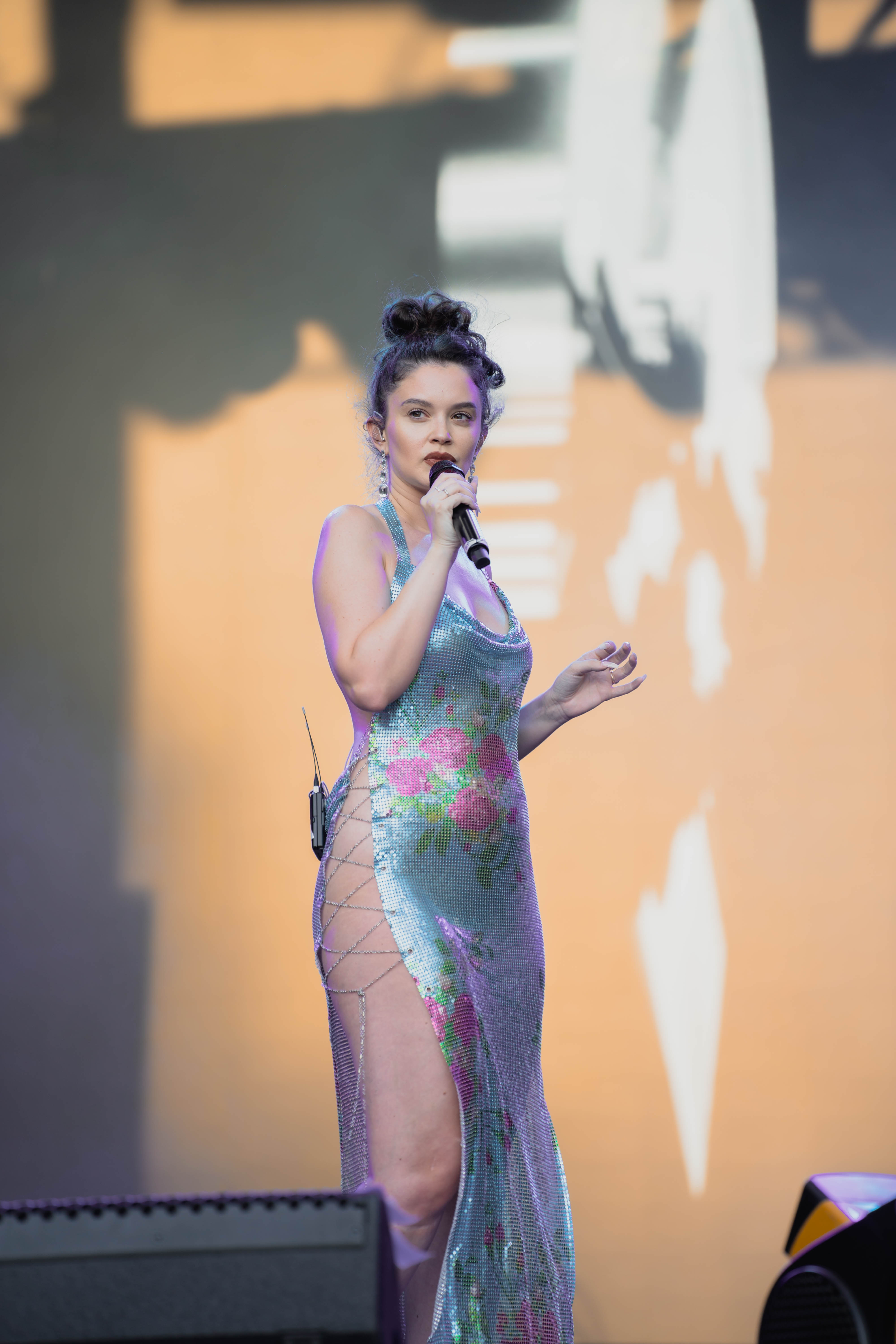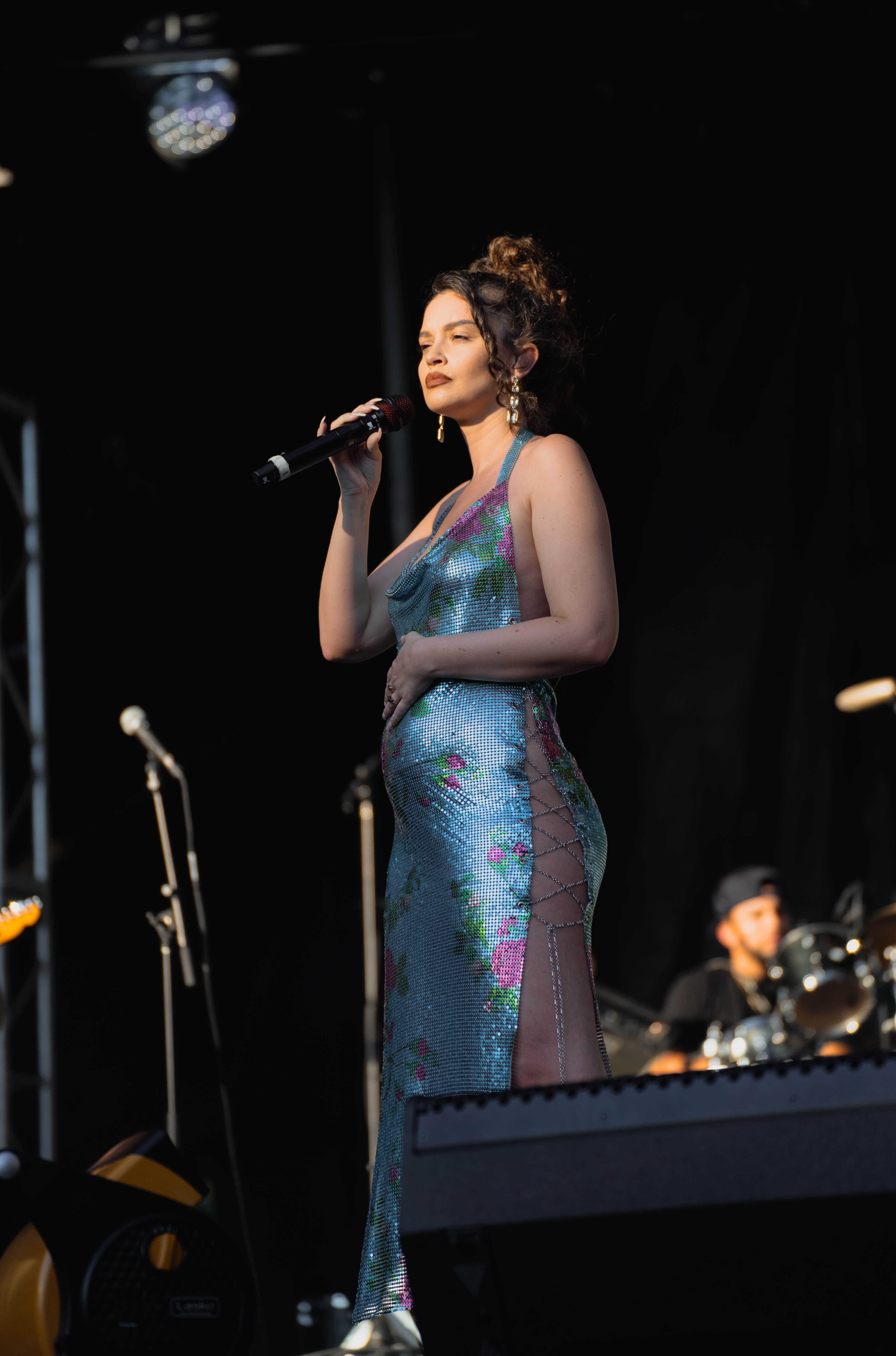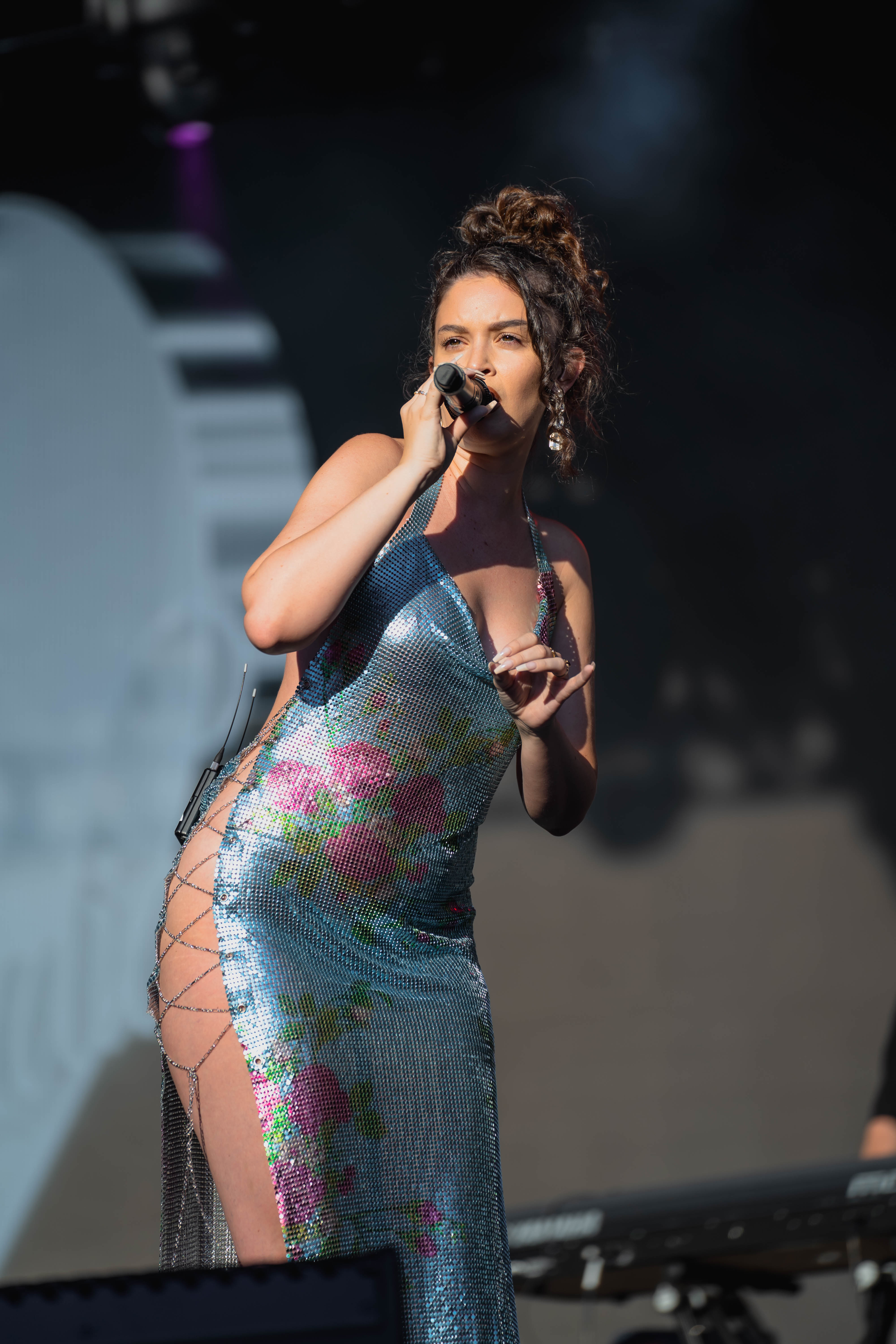 Taking the Blume Stage, Sabrina Claudio delivered an electrifying 30-minute set that left the crowd in awe. Despite the abbreviated performance duration compared to her full concerts, Claudio managed to captivate and invigorate her audience. At precisely 6:30 PM, a beaming Sabrina Claudio emerged onto the stage, eliciting roars of excitement from the crowd. Dressed in a sparkling sequin dress adorned with delicate flowers, she effortlessly commanded attention. An unforgettable moment occurred as Claudio interacted with a fan in the front row, playfully inquiring, “Are you from TikTok? Oh my god, I love your videos.” The exchange, met with laughter, seamlessly melded into her musical journey, leaving the audience yearning for more.