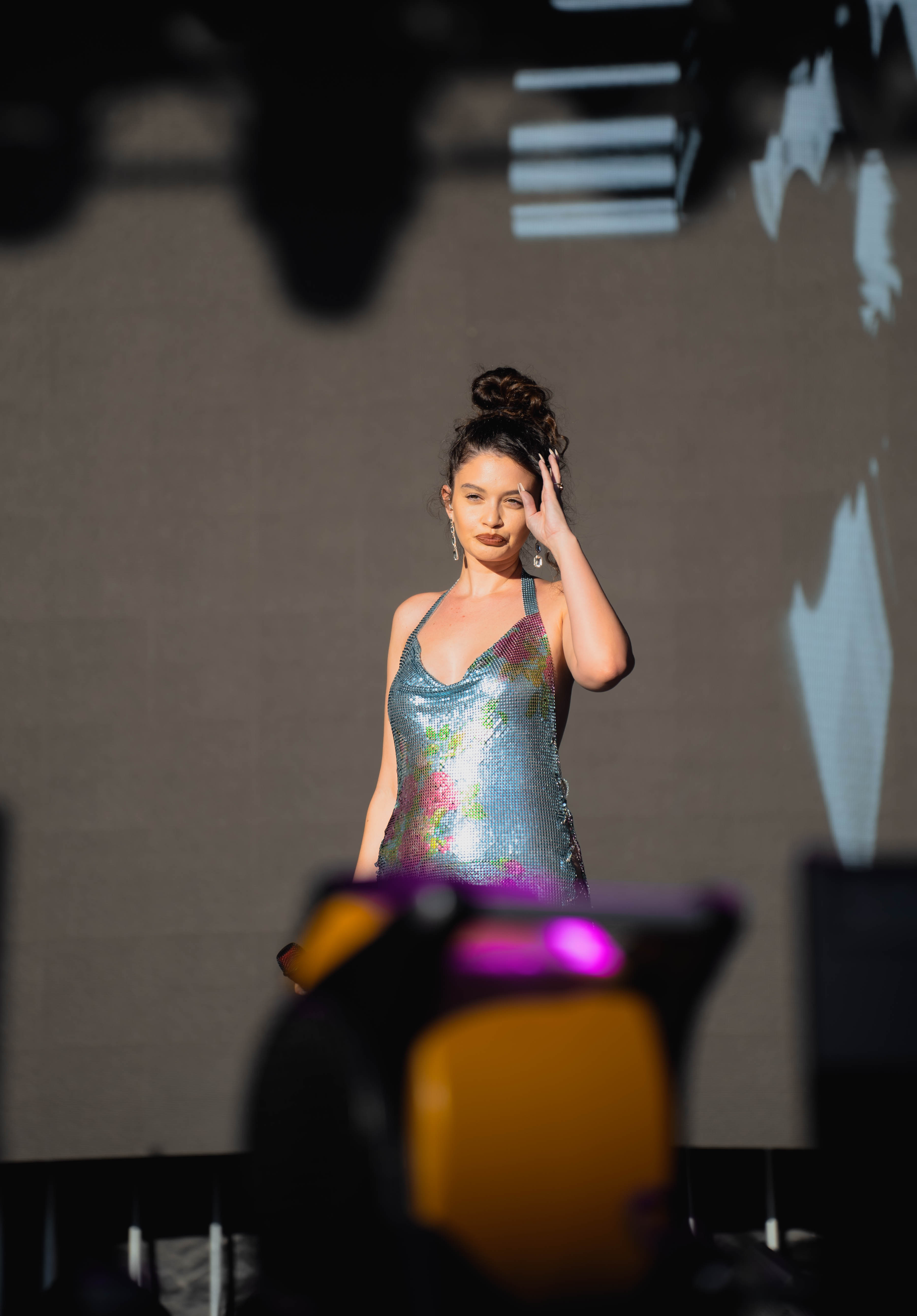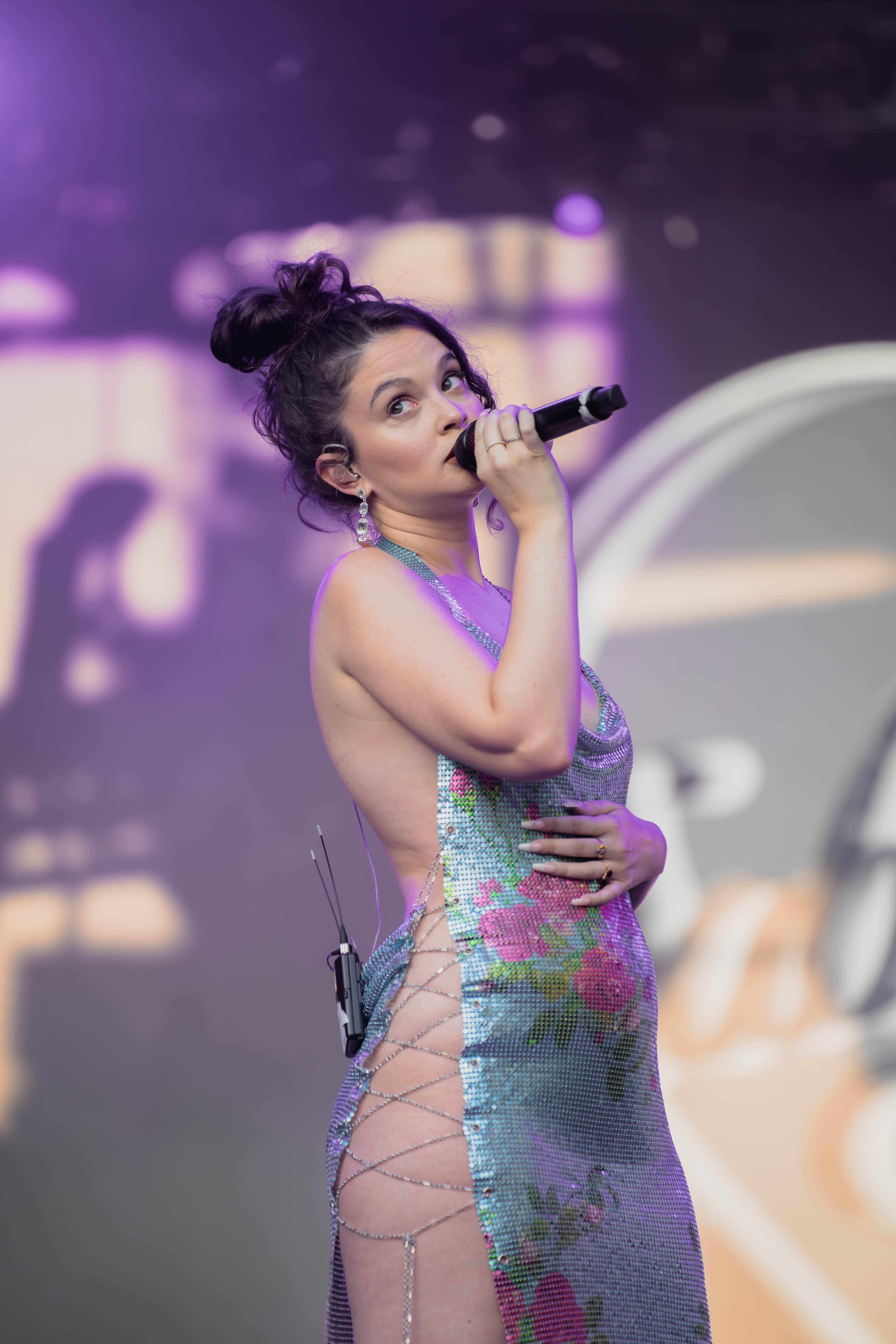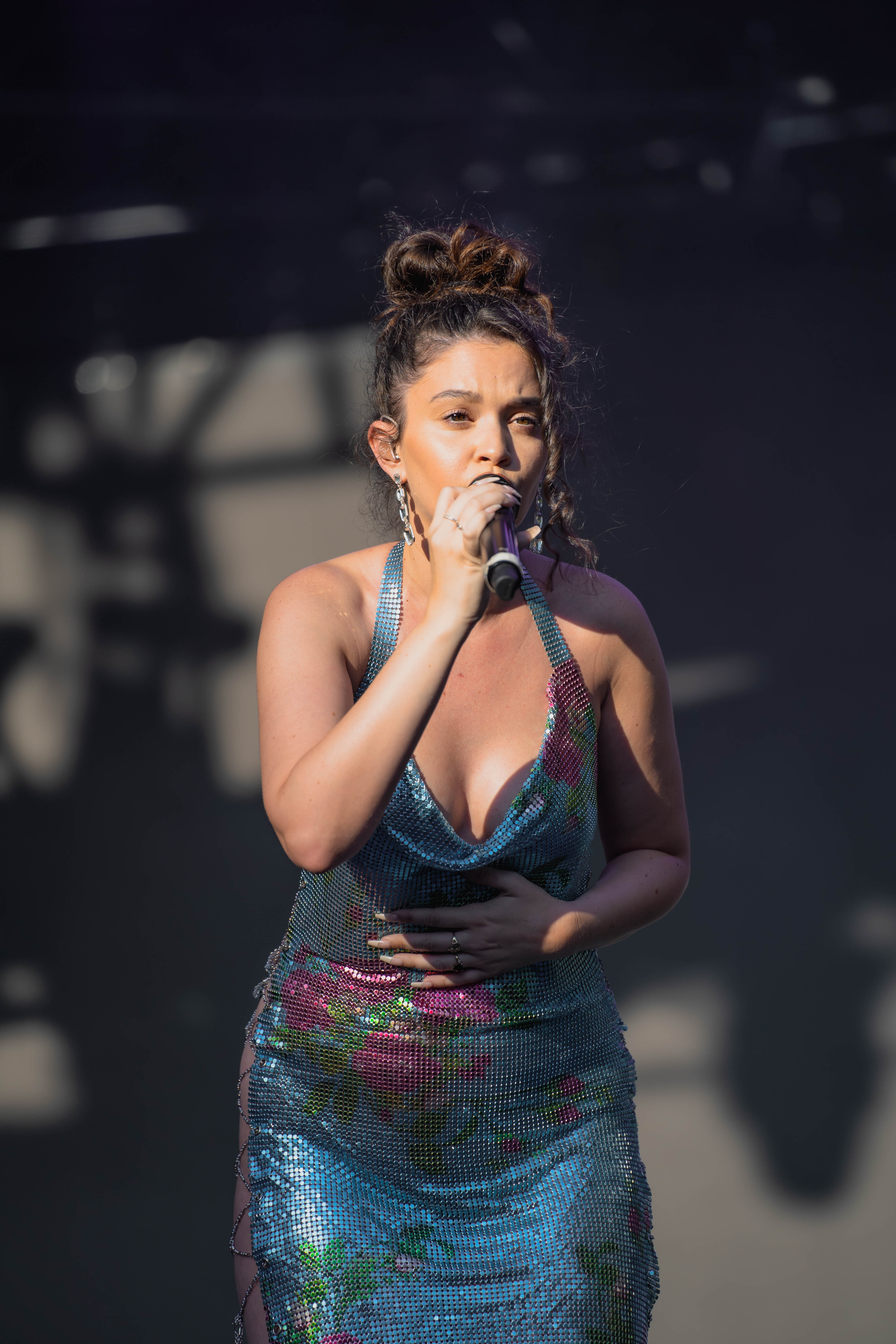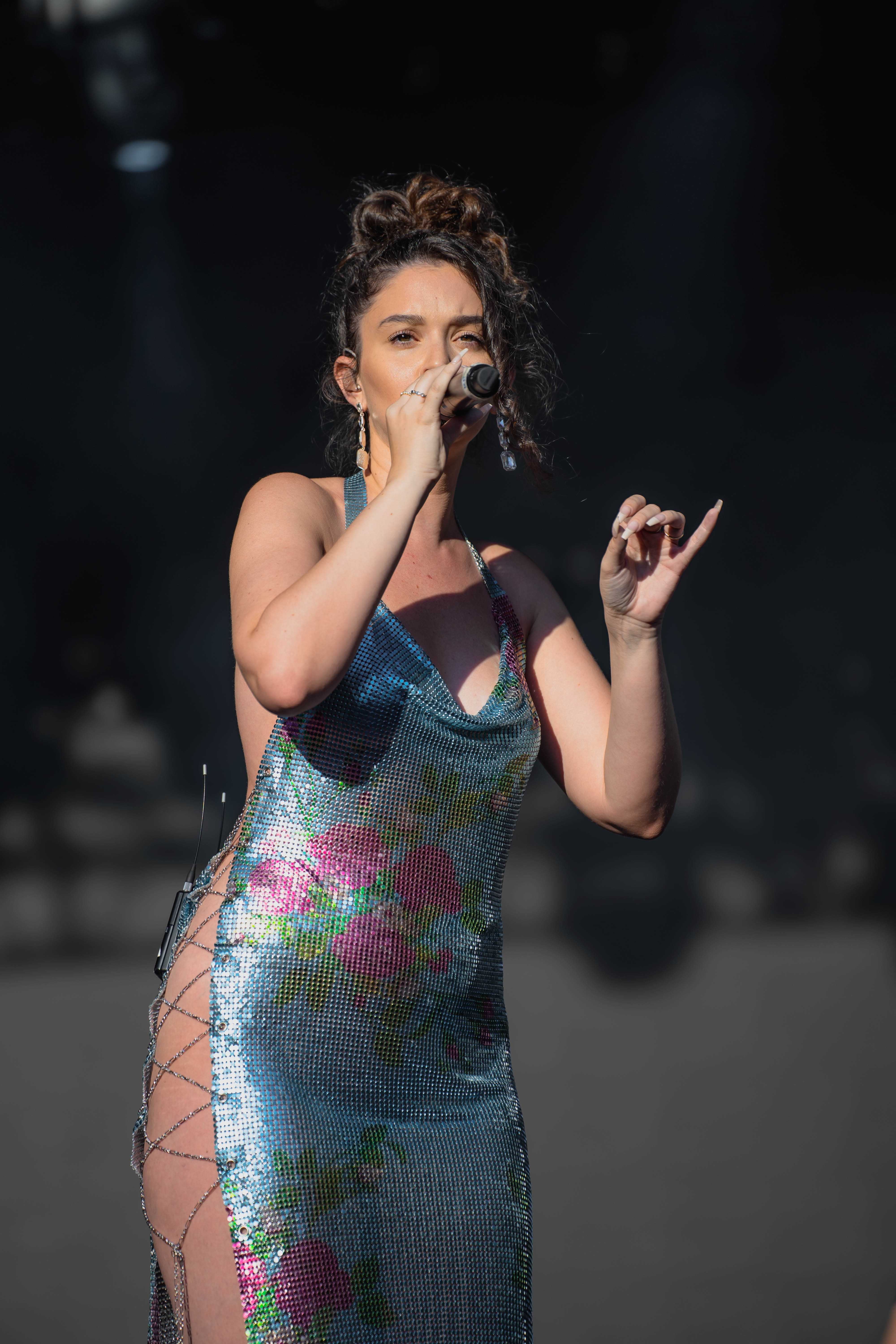 Taking the Blume Stage, Sabrina Claudio delivered an electrifying 30-minute set that left the crowd in awe. Despite the abbreviated performance duration compared to her full concerts, Claudio managed to captivate and invigorate her audience. At precisely 6:30 PM, a beaming Sabrina Claudio emerged onto the stage, eliciting roars of excitement from the crowd. Dressed in a sparkling sequin dress adorned with delicate flowers, she effortlessly commanded attention. An unforgettable moment occurred as Claudio interacted with a fan in the front row, playfully inquiring, “Are you from TikTok? Oh my god, I love your videos.” The exchange, met with laughter, seamlessly melded into her musical journey, leaving the audience yearning for more.