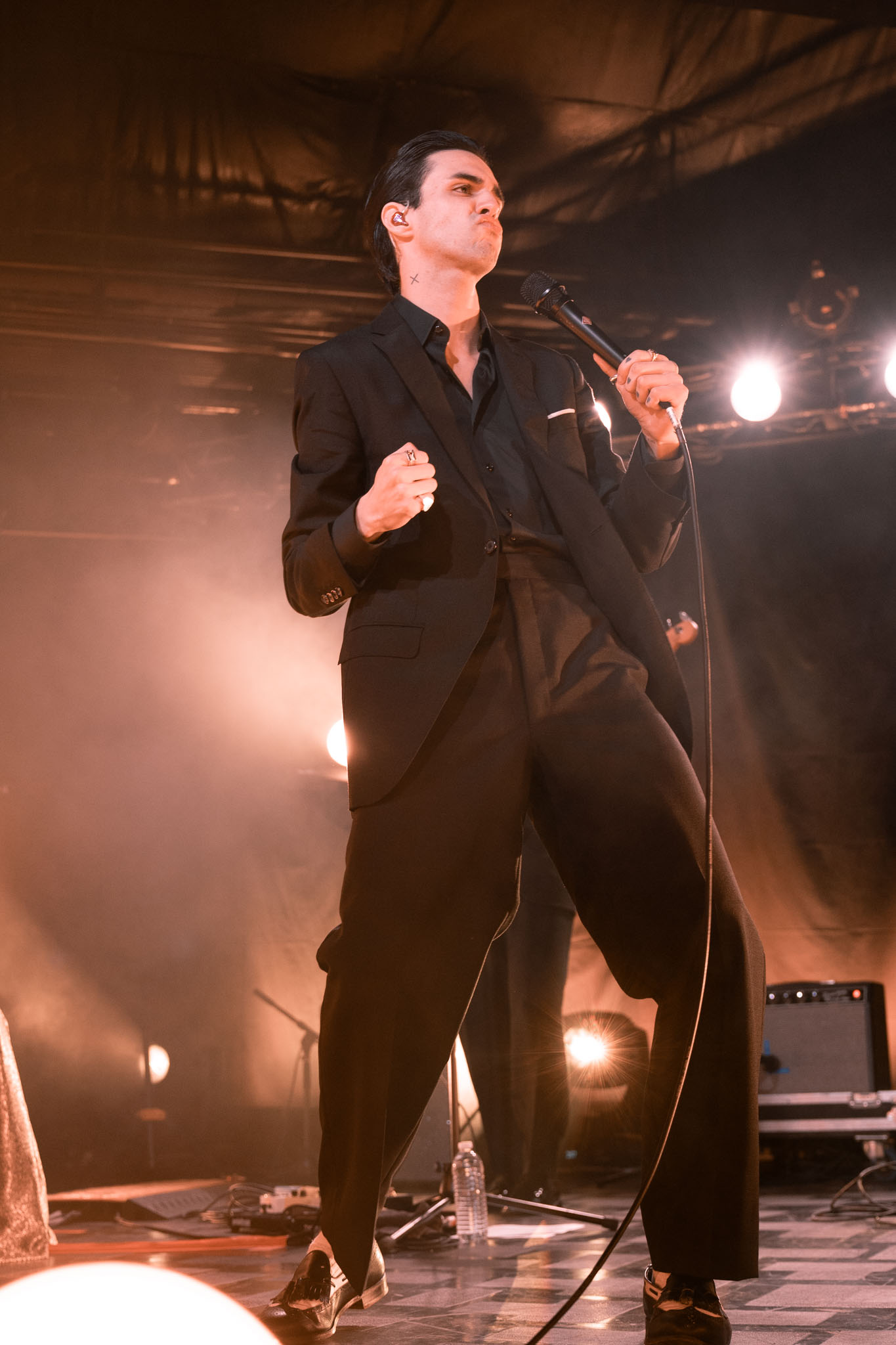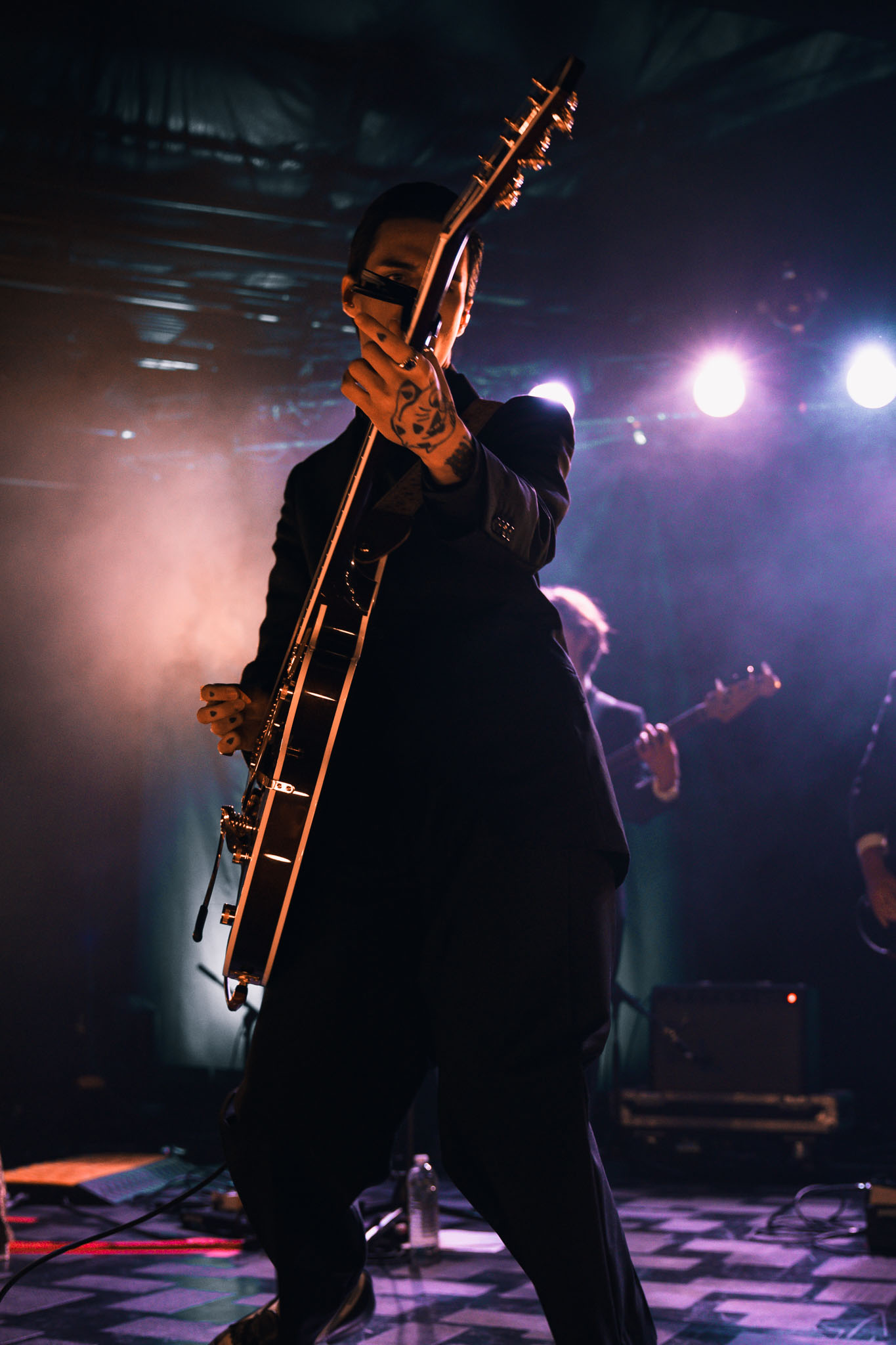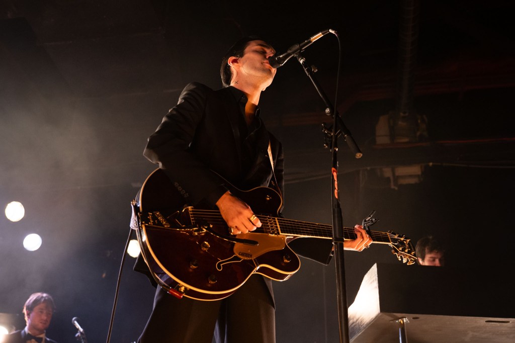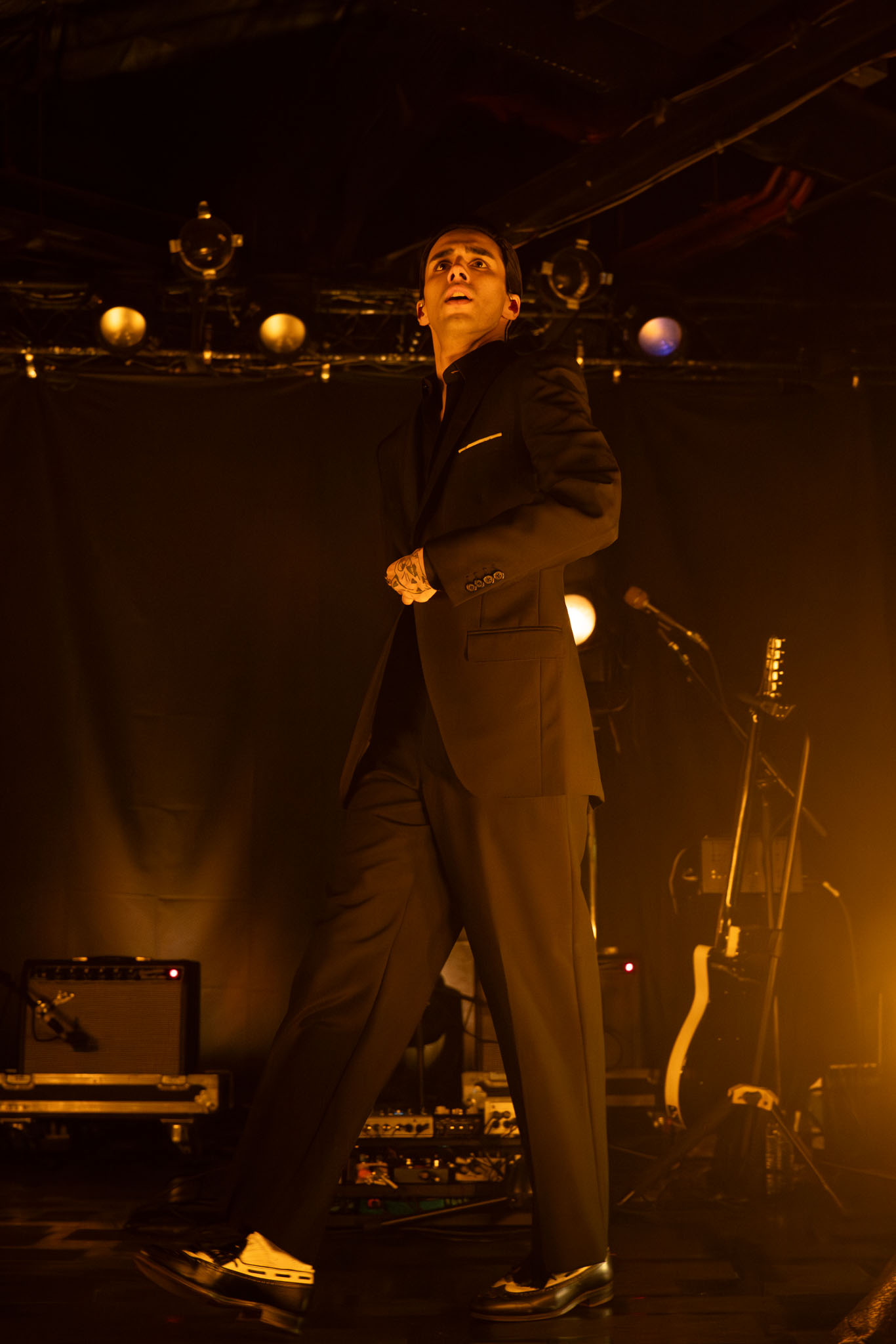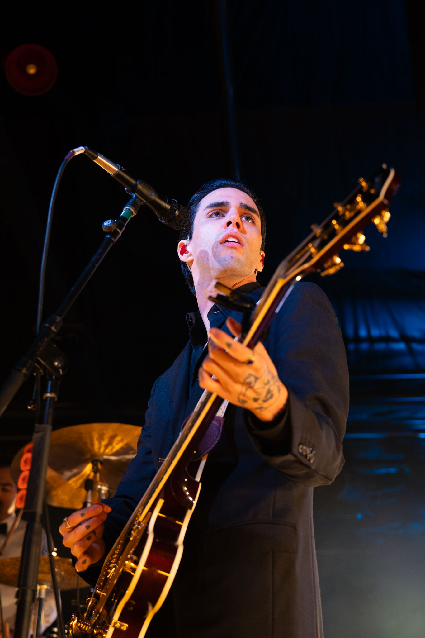 As Sanchez took the stage around 9:30, the audience was met with a captivating vintage atmosphere. A line of light bulbs adorned the front of the stage and surrounded the instruments, casting an enchanting glow that transported us back in time. Sanchez himself made a grand entrance, dressed with the sleek elegance of Elvis Presley, complete with slicked-back hair. The moment he appeared, fans erupted into ecstatic cheers.