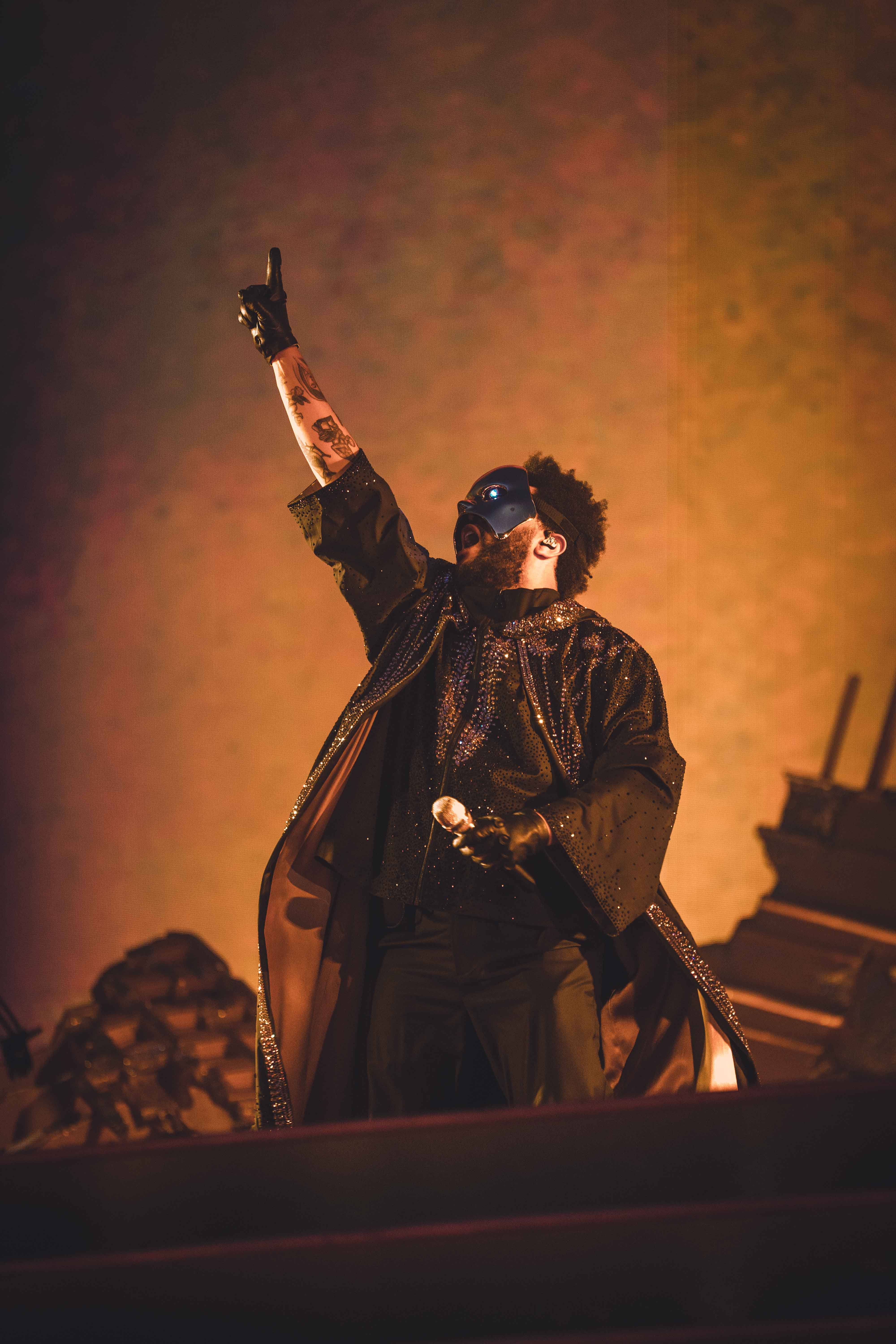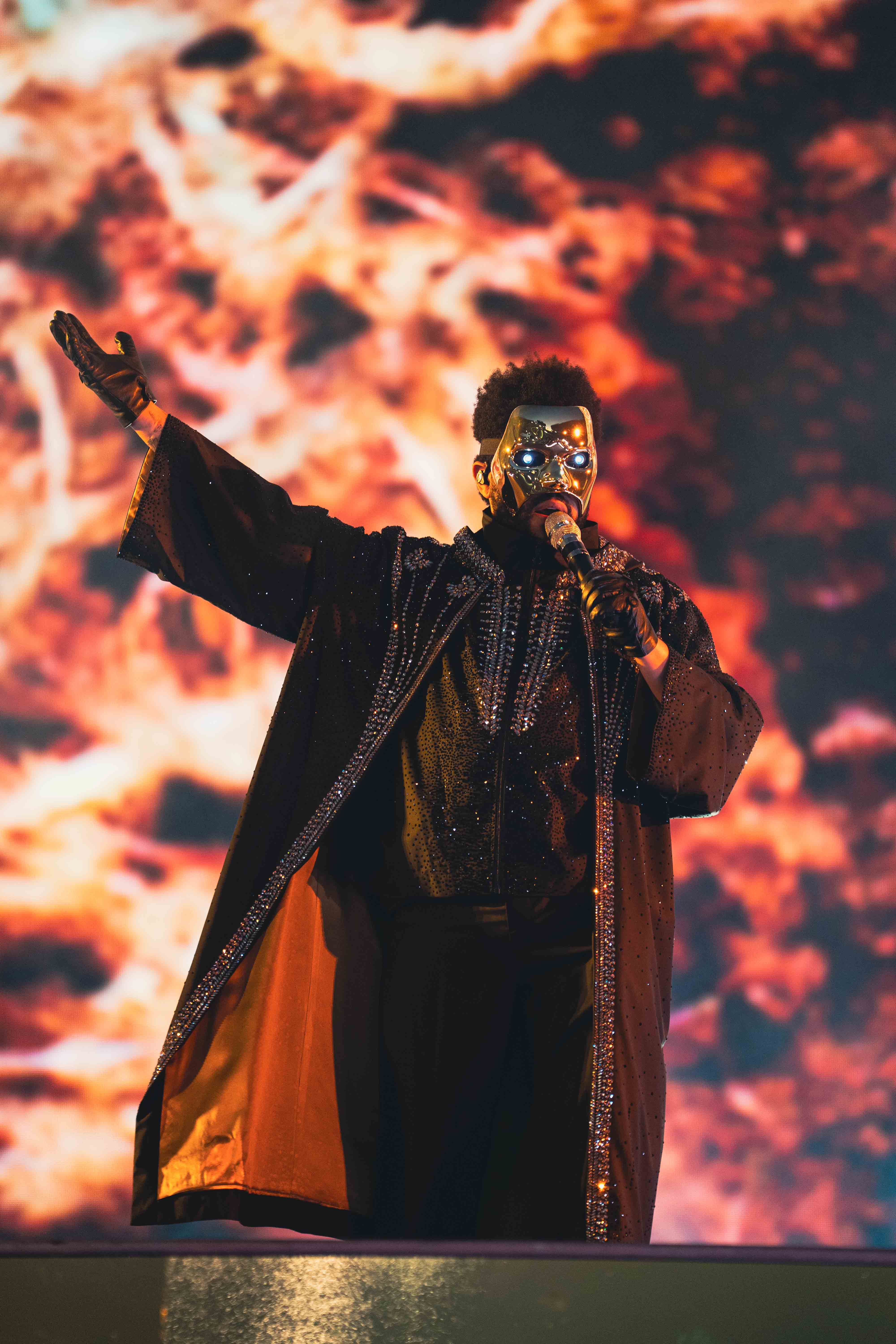The Weeknd’s set started at exactly 8:45 PM with “The Abyss” as dancers made their slow, cinematic climb up the stage. Then out walked Abel, wearing a sparkling robe that fans would recognize from his Hurry Up Tomorrow film and music video. It felt like a scene straight out of a movie. From there, he rolled right into “Wake Me Up” and “After Hours,” and the crowd was fully locked in.