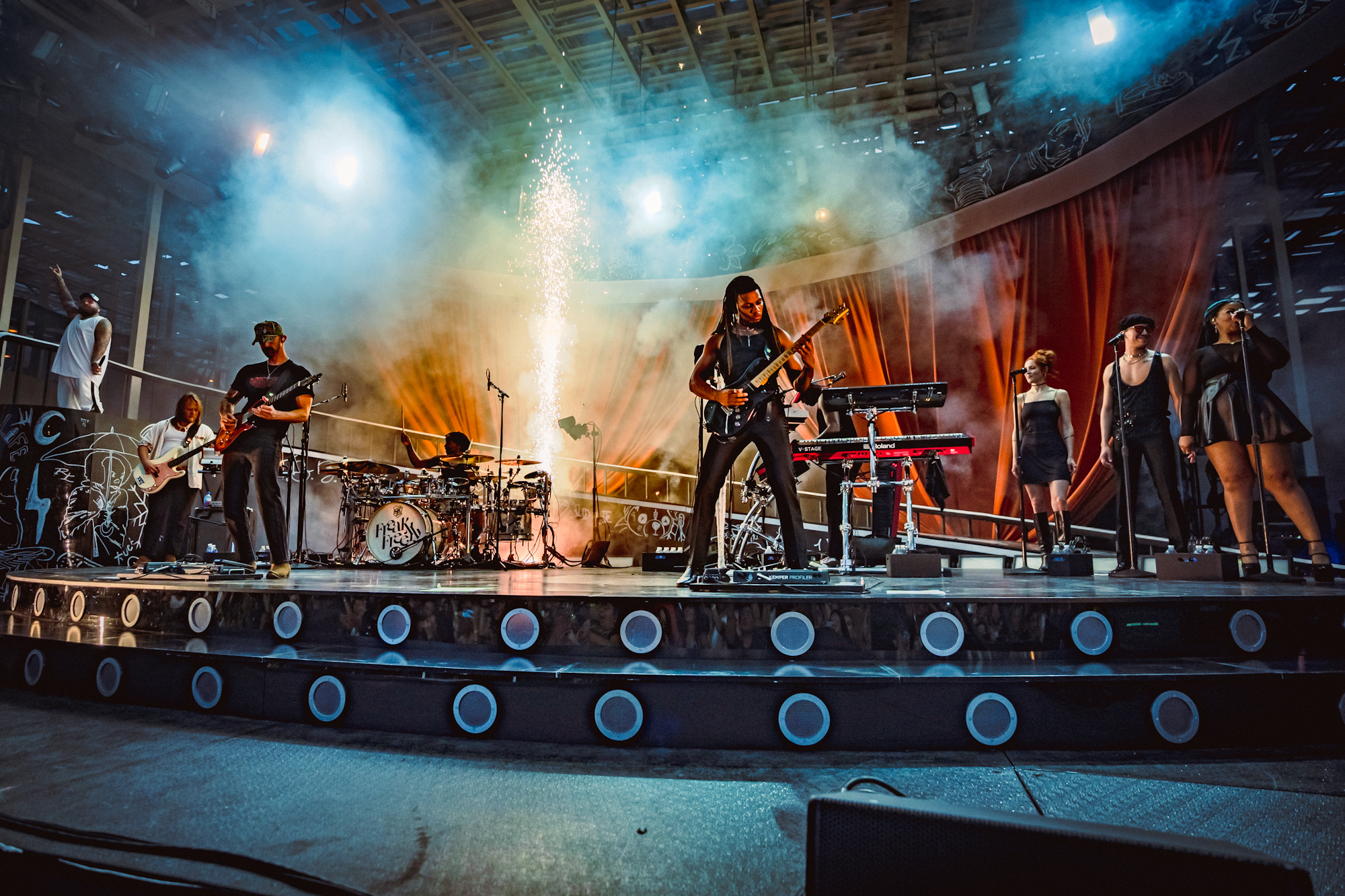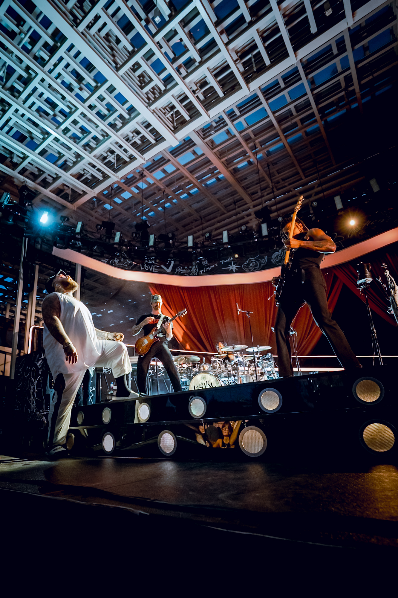 The rest of the set moved between raw honesty and pure fun. “Something I’ll Never Know,” written by his brother about a breakup, came with a smirk and the quick aside, “She sucks, but I’m doing great.” “Lose Control” turned the stage into a galaxy, and “Guilty” splashed his teddy bear mascot across the screens as it was parodied into different influential music album covers like Dr. Dre, Amy Winehouse, Bowie, Metallica, and Etta James. A new song, “God Went Crazy,” felt like a deep cut straight from his musical influences.