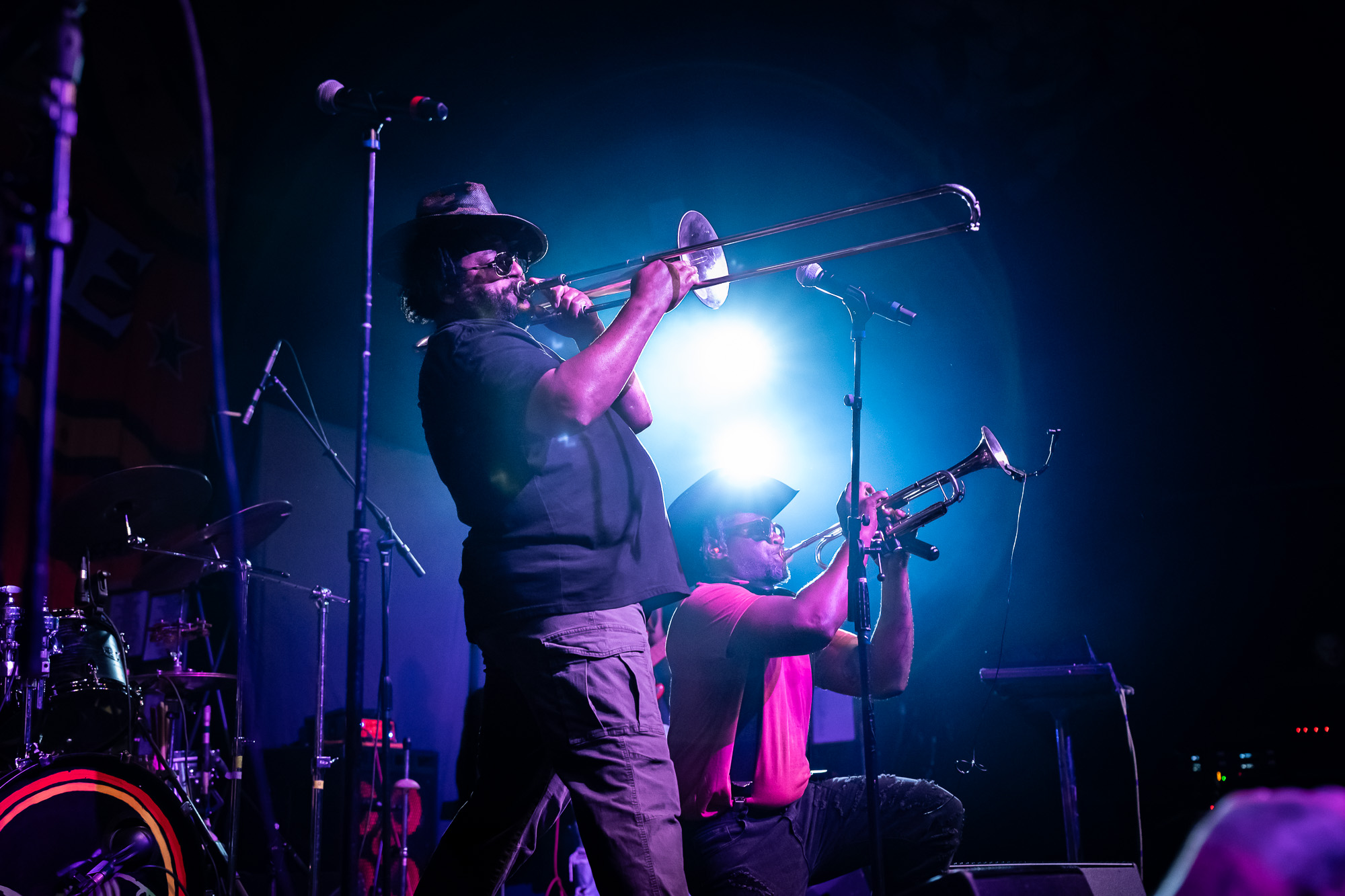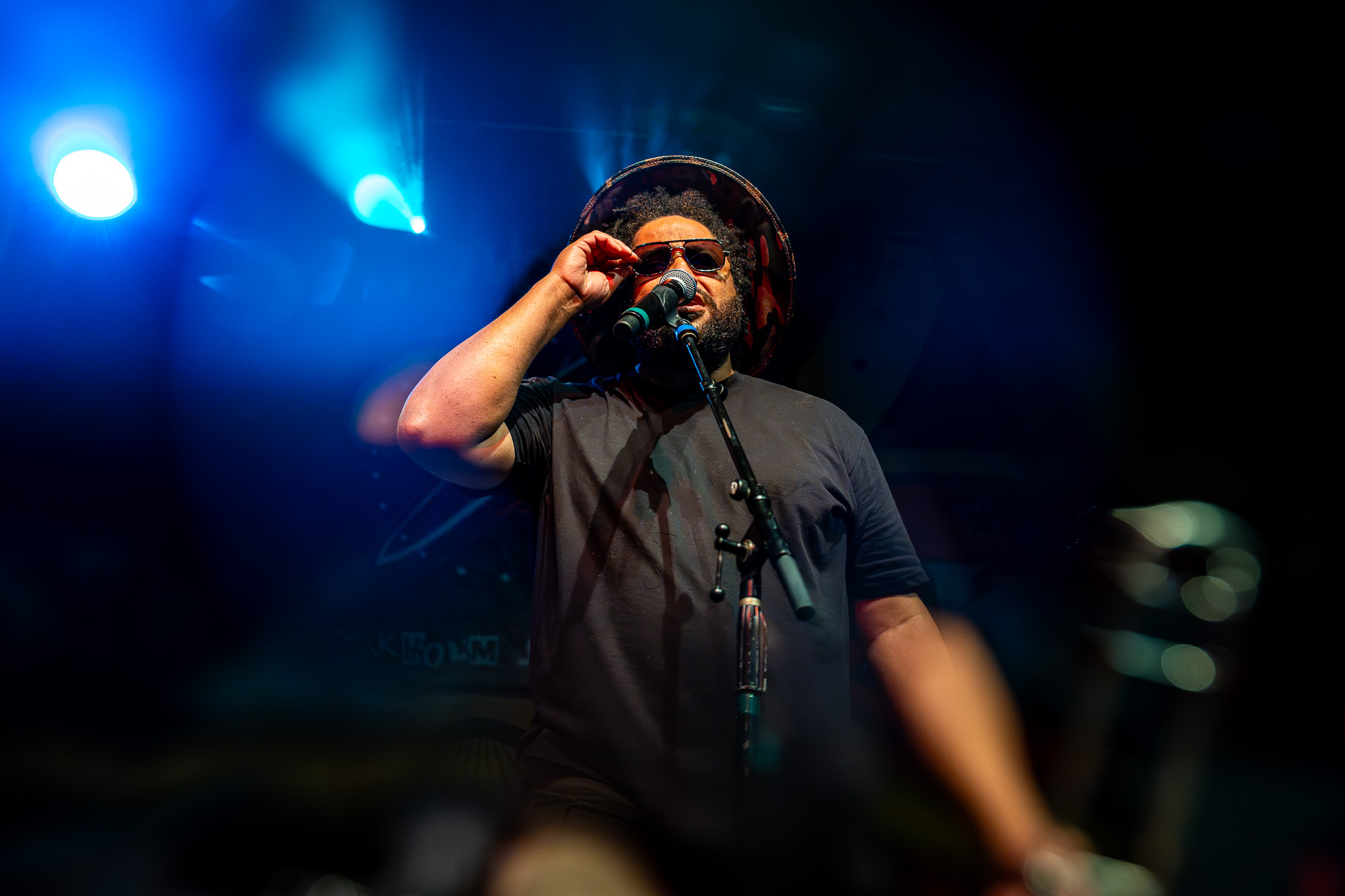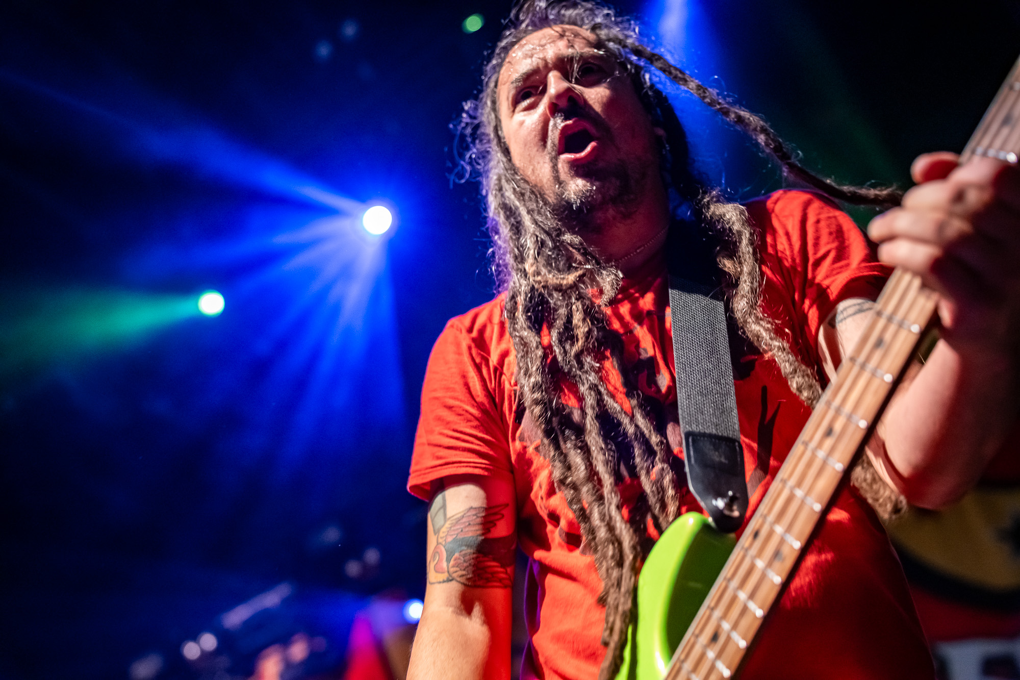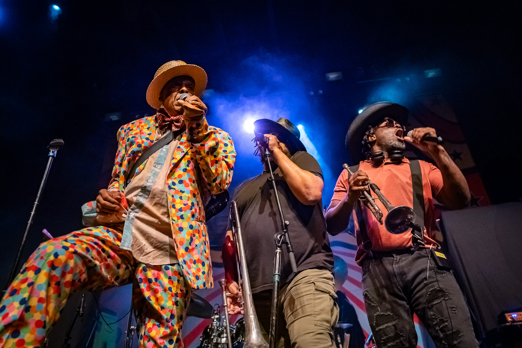 Fishbone took the stage at 8:36 pm, bringing their unmistakable blend of funk, punk, and ska. Saxophone in hand, Angelo Moore commanded every inch of the stage with boundless energy. Their set featured groove-heavy jams, playful audience interaction, and even included the night’s first female guest vocalist. By the time they wrapped up at 9:08 pm, the room buzzed with anticipation.