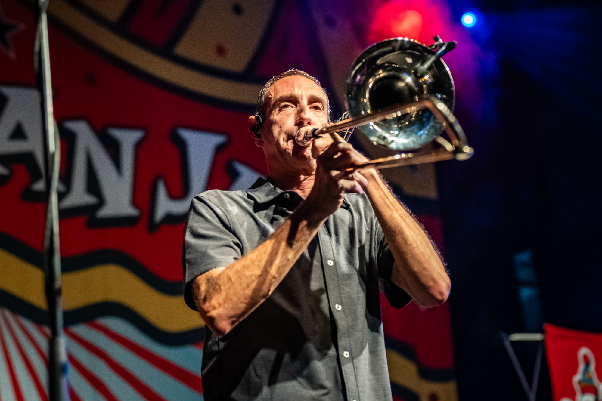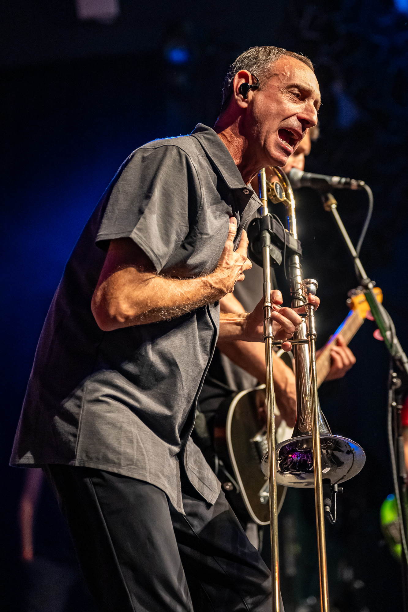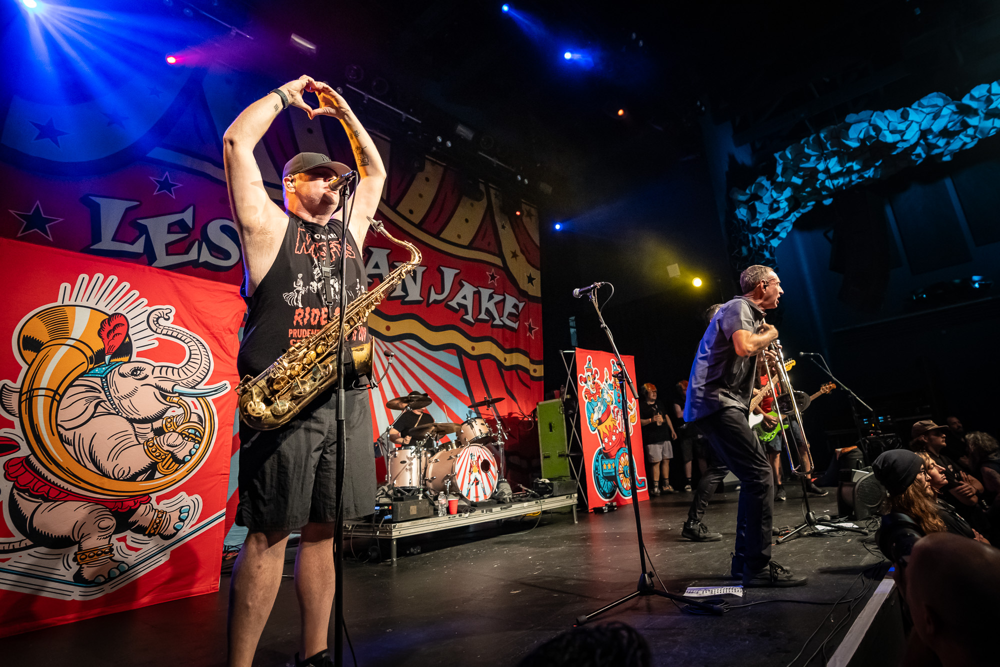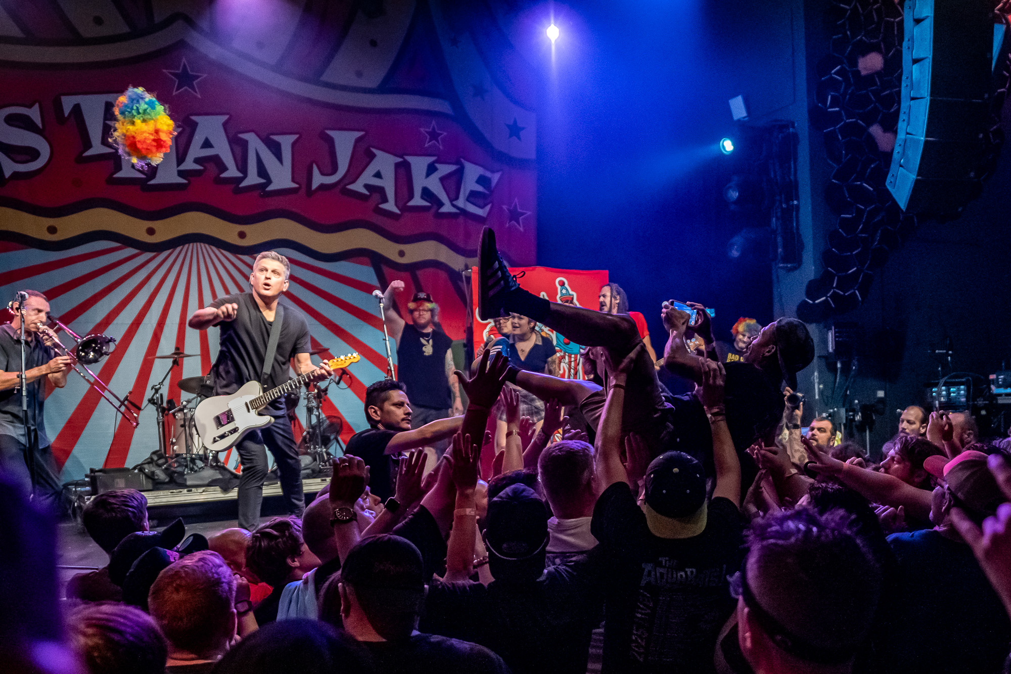 Less Than Jake stormed the stage at 9:36 pm with “Gainesville Rock City,” igniting an immediate crowd explosion. Bassist Roger Lima engaged fans from the start, cracking jokes with the front row and playfully ribbing Maroon 5. The band then blazed through fan favorites including “Lie to Me,” “Johnny Quest Thinks We’re Sellouts,” “Walking Pipebomb,” and “Metalheads.” Trombonist Buddy Schaub and saxophonist JR Wasilewski powered the brass section with thunderous energy while the mosh pit whirled in perpetual motion.
