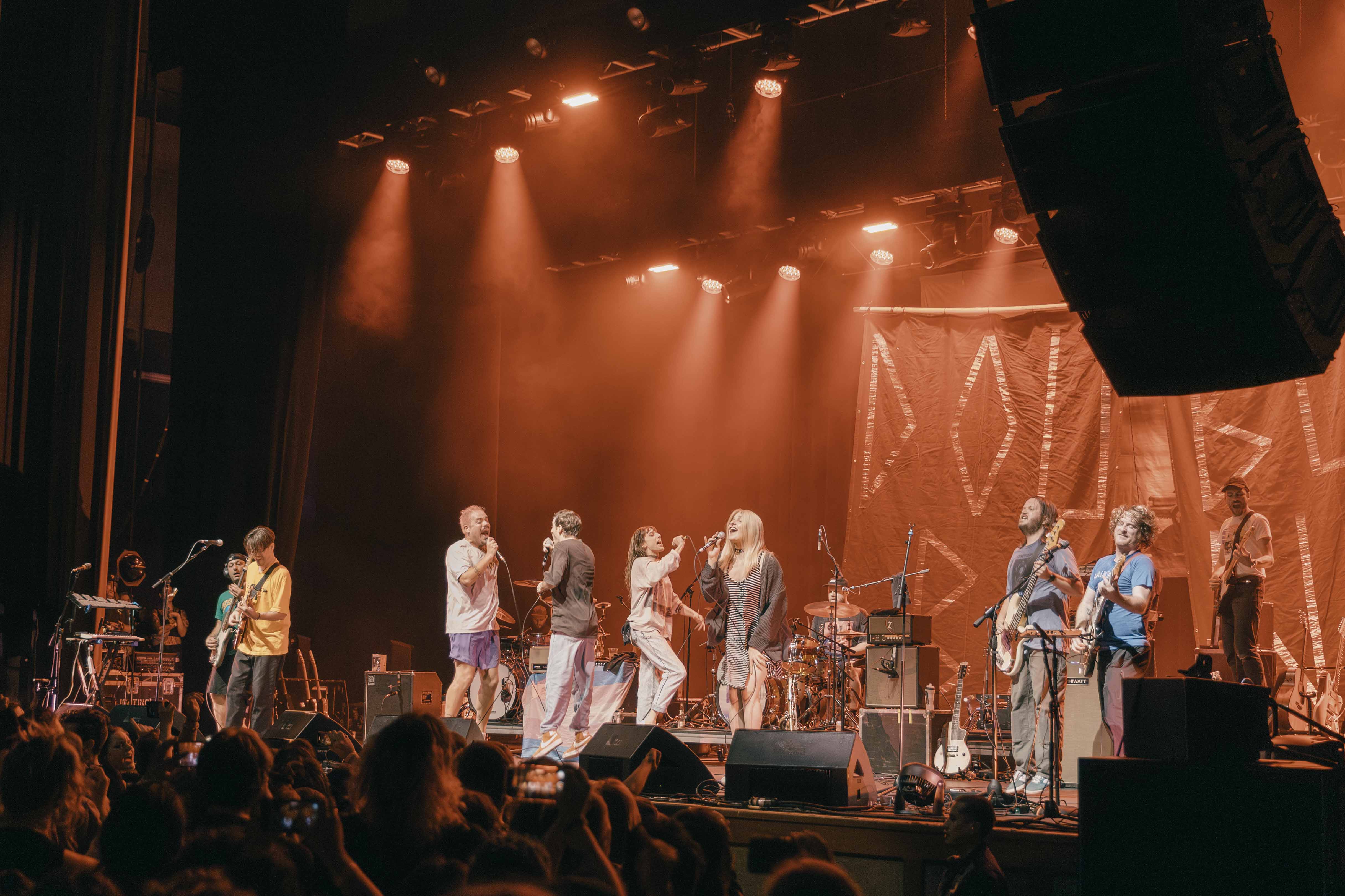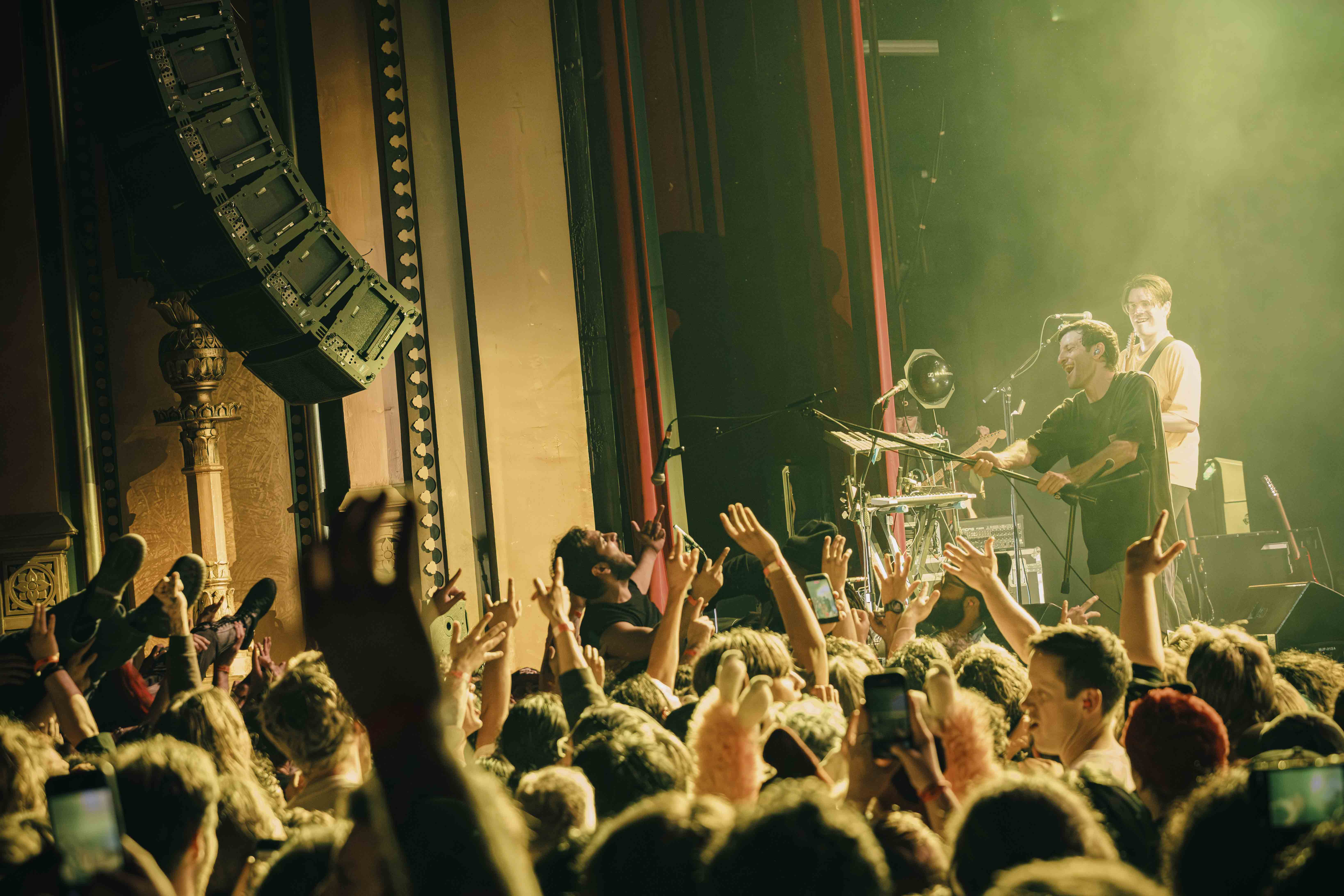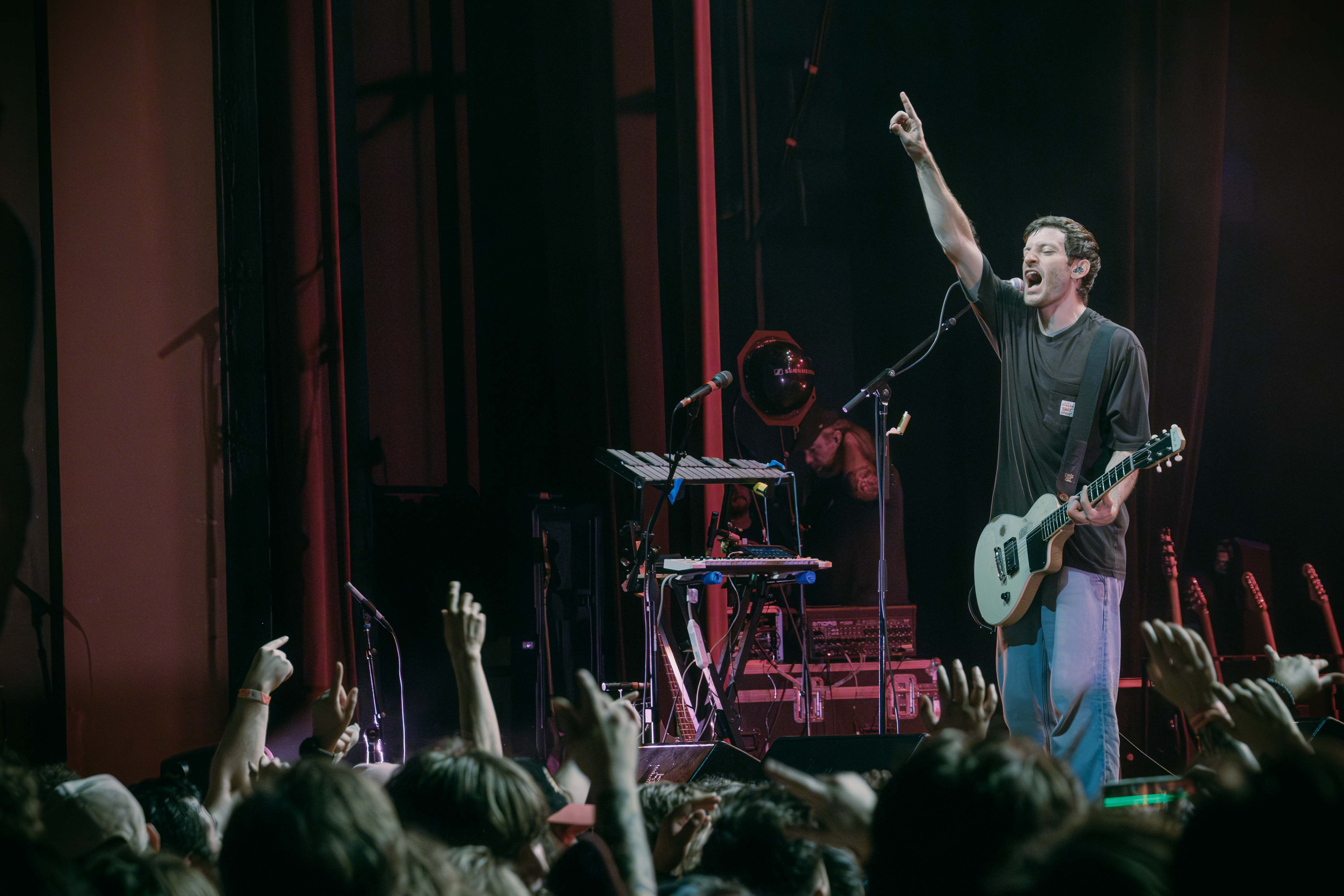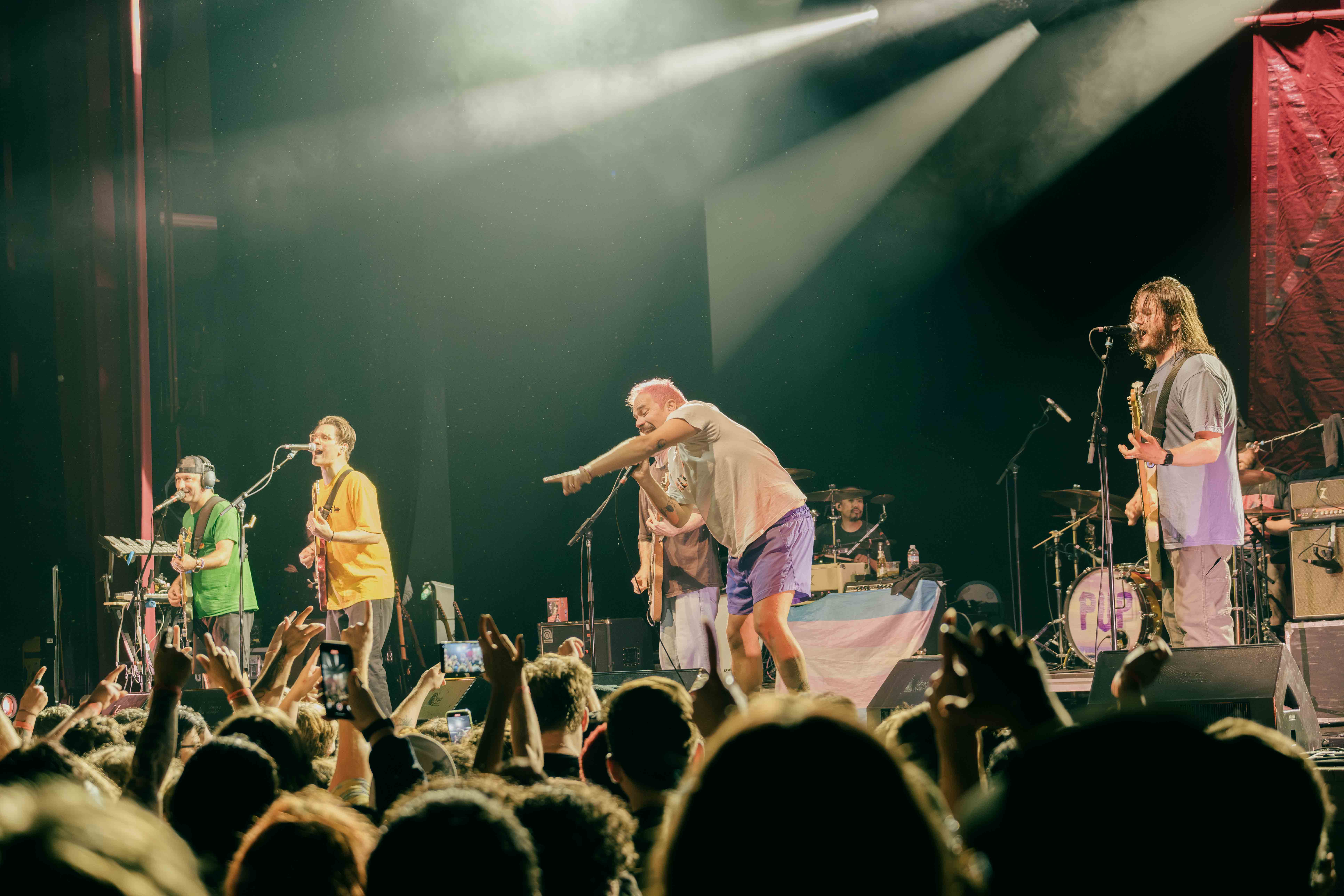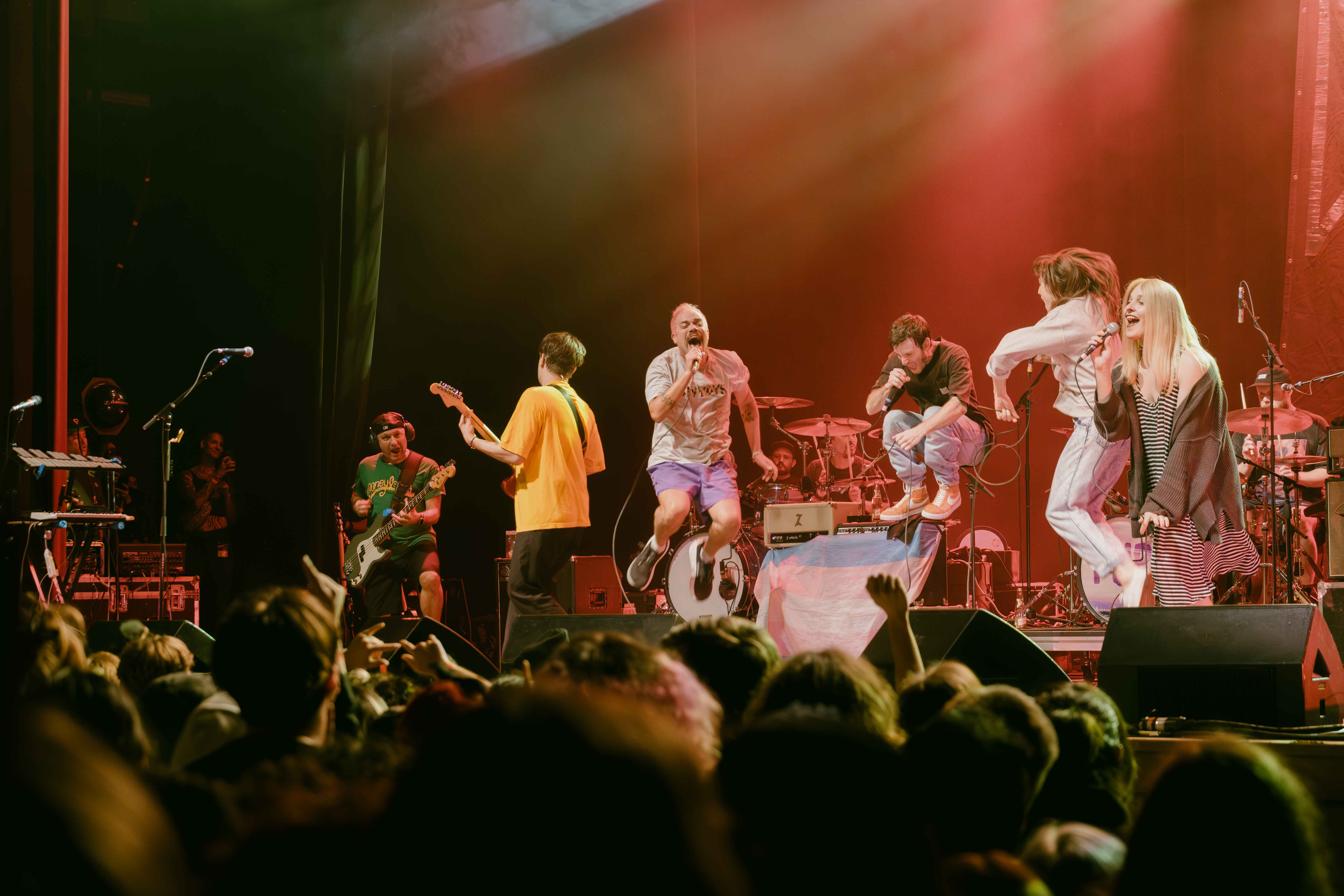 Near the end of the night, Babcock announced that they had prepared a surprise for the audience, and set to the familiar strains of “Thus Spake Zarathustra”, a homemade banner of black cloth and silver gaffer tape rose in the back of the stage, proclaiming “DOUBLE BAND”. So began the highlight of the night, with PUP welcoming Rosenstock and his entourage back on stage to collaborate for four songs. The two bands played together like old friends relishing the height of the party, with Rosenstock whirling around stage between the monitors and Babcock leaping off it for a brief crowdsurf, but the night was not yet finished–both bands invited opener Ekko Astral to share the stage with them as well and closed the night with a raucous cover of Alanis Morisette’s “You Oughta Know” that had concertgoers skipping and shouting out the exits of the Fox Theater–at least, those who didn’t stay for the impromptu dance part in the pit as “Hot to Go!” played post-concert.