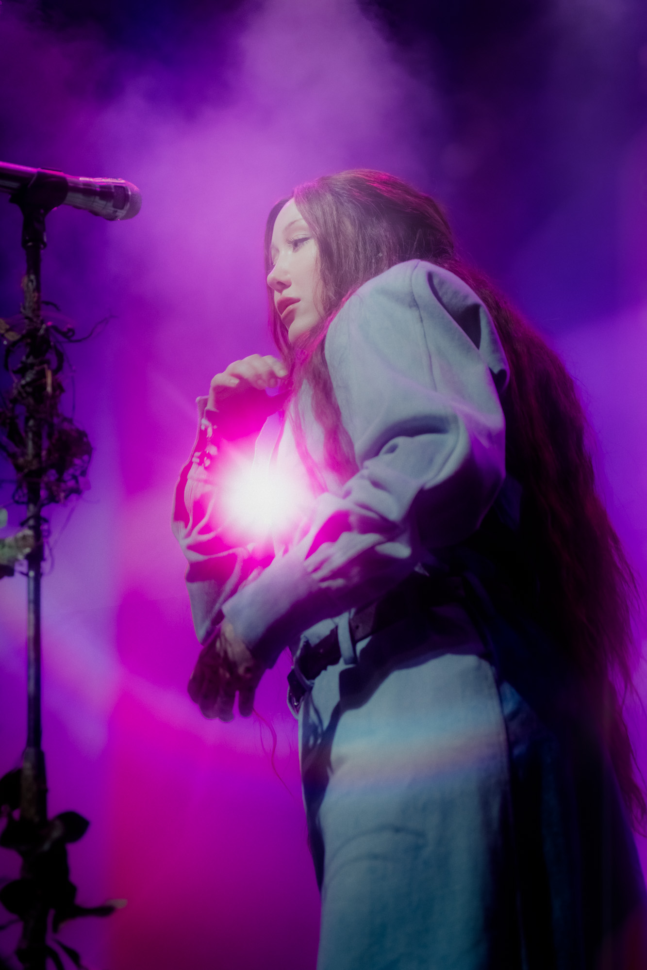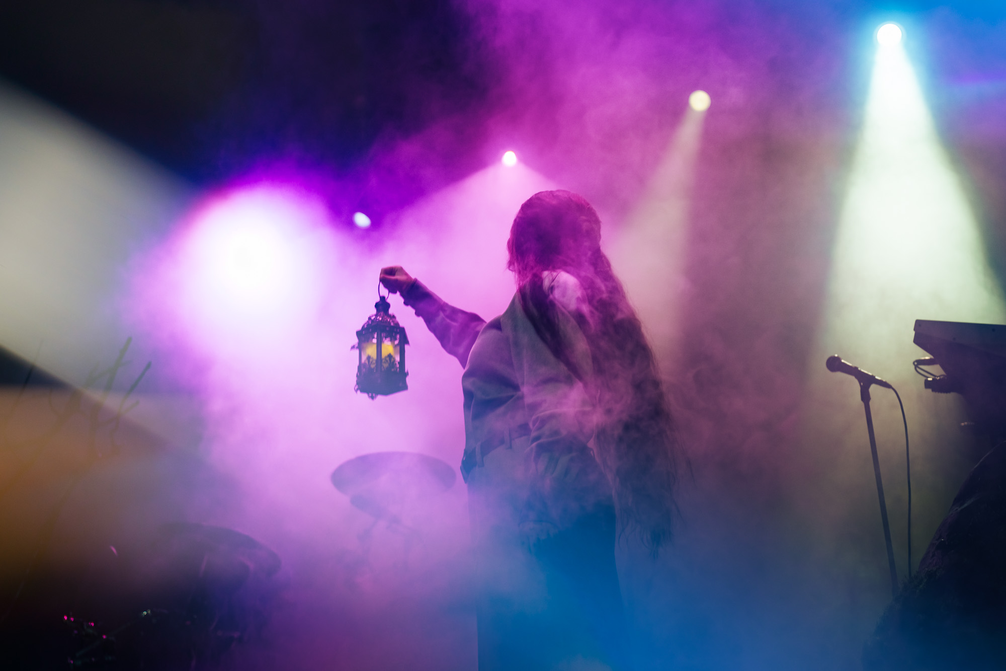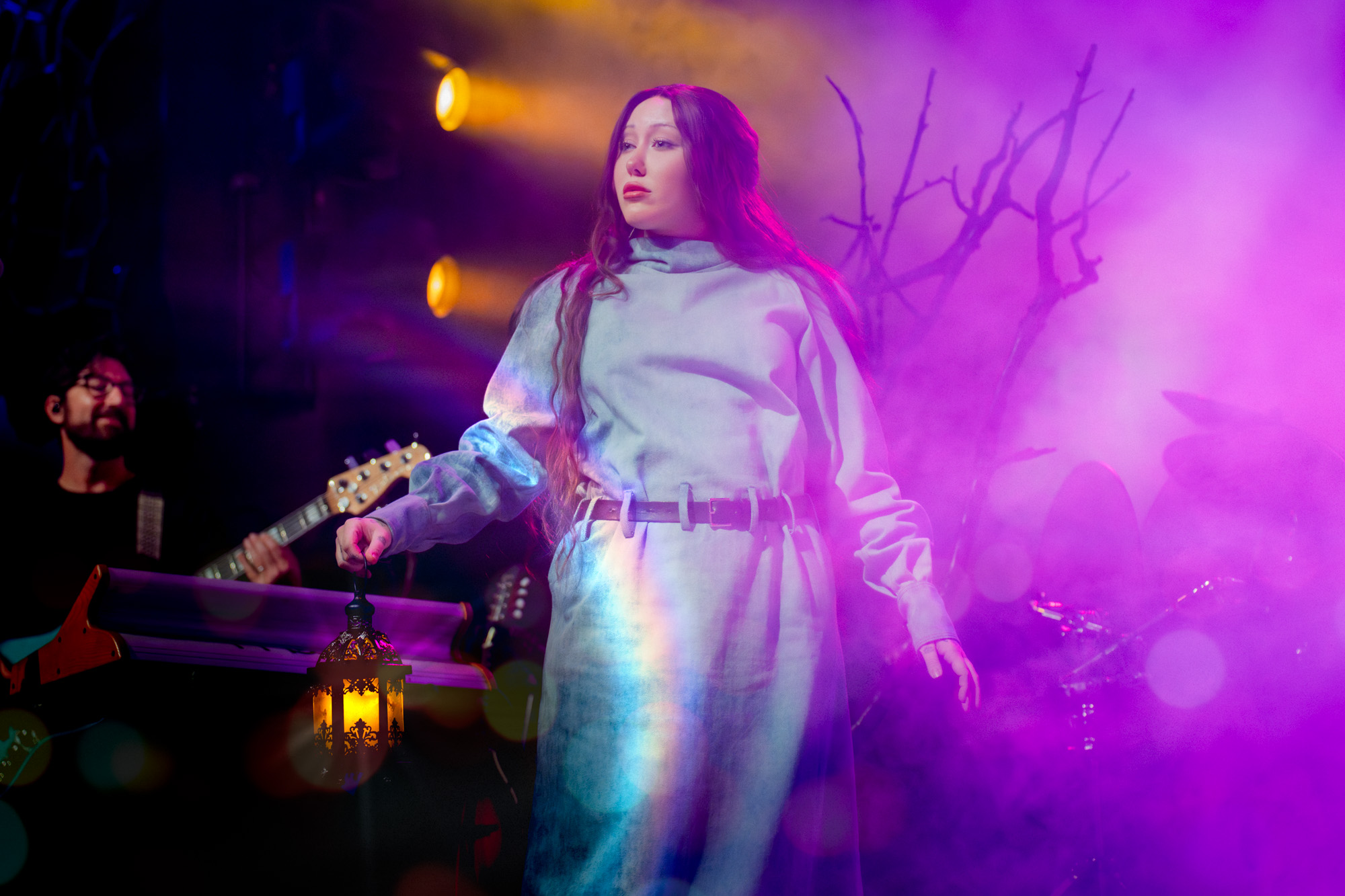 By 9:00 pm, the lights dimmed and a soft glow drifted across the fog-filled stage. Noah Cyrus emerged holding a single lantern that flickered gold against her robe as she made her way to center stage. The set looked alive, with rocks covered in moss, vines wrapping around the mic stand, and slender trees stretching upward from either side. Muted greens and ambers washed over the backdrop, creating a woodland scene that felt both grounded and dreamlike. She placed the lantern beside the mic stand and began “I Saw the Mountains,” her voice carrying softly through the haze as the crowd fell silent. The song opened the night in a reflective and almost spiritual way, setting the tone for what was to come.