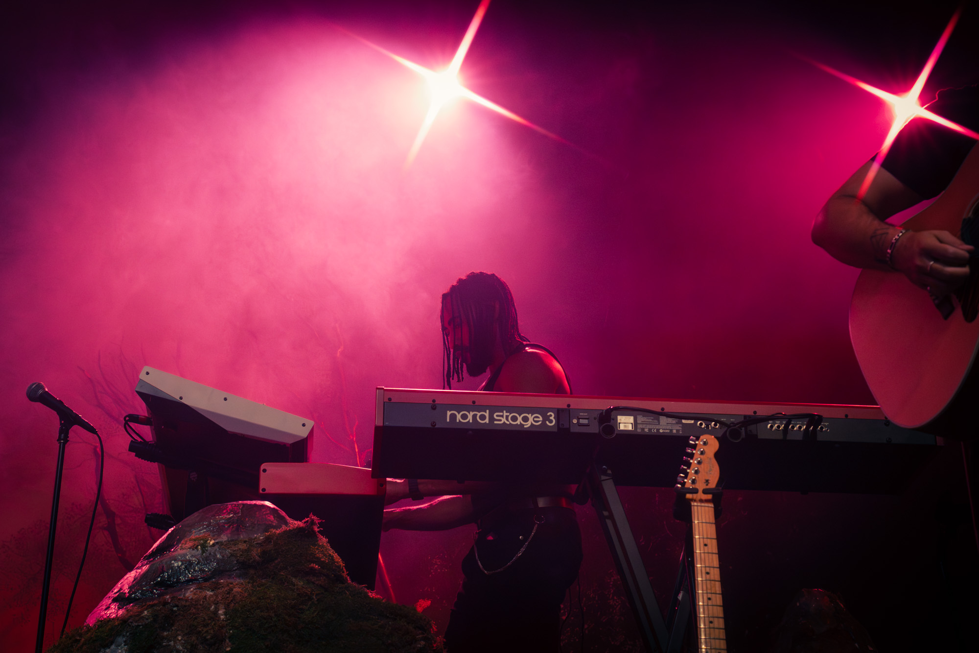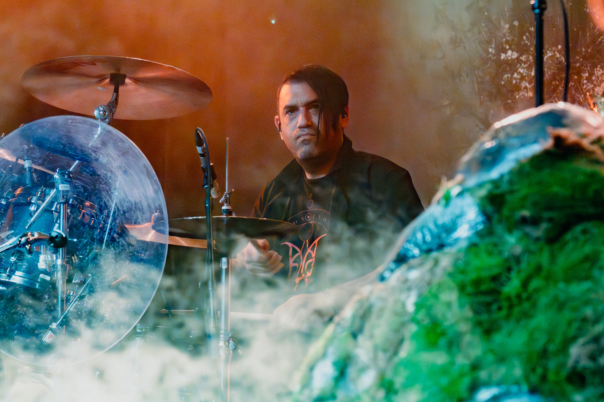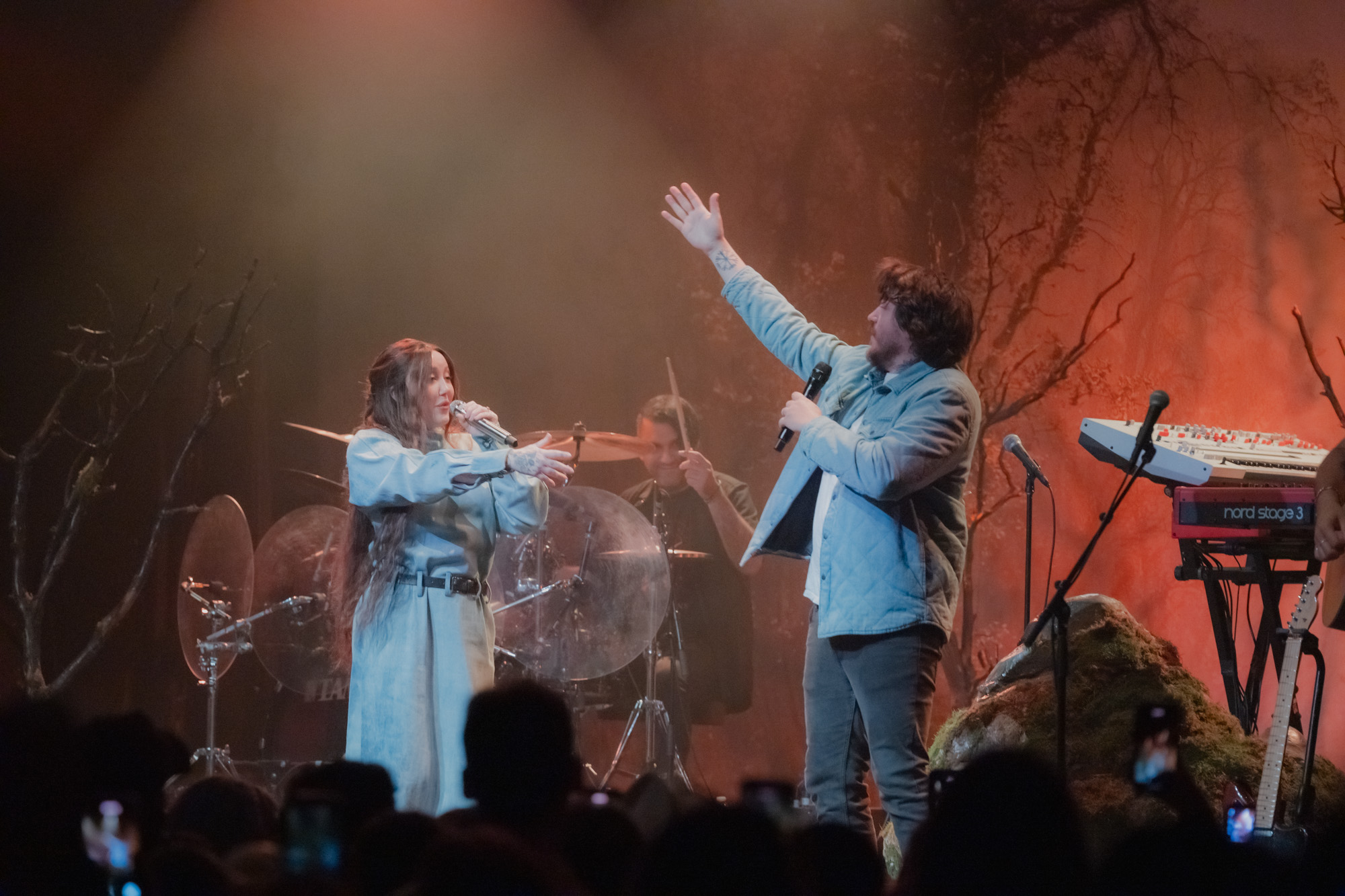 By 9:00 pm, the lights dimmed and a soft glow drifted across the fog-filled stage. Noah Cyrus emerged holding a single lantern that flickered gold against her robe as she made her way to center stage. The set looked alive, with rocks covered in moss, vines wrapping around the mic stand, and slender trees stretching upward from either side. Muted greens and ambers washed over the backdrop, creating a woodland scene that felt both grounded and dreamlike. She placed the lantern beside the mic stand and began “I Saw the Mountains,” her voice carrying softly through the haze as the crowd fell silent. The song opened the night in a reflective and almost spiritual way, setting the tone for what was to come.