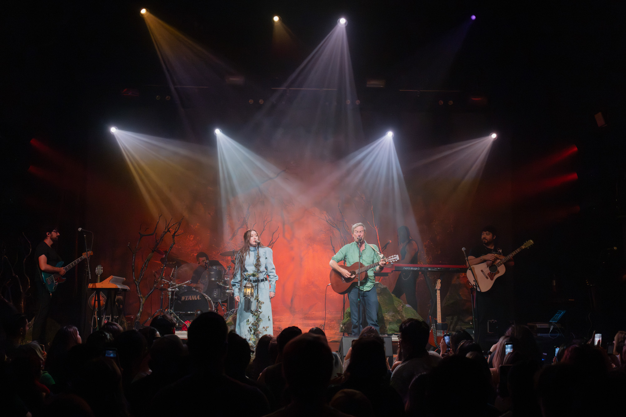 Noah then shared a story from their childhood. “He used to drive me to school every day,” she said, smiling toward him. “And this was one of those songs that stood for our love of music.” The crowd fell silent as she began Band of Horses’ “The Funeral.” Moody blue and violet lights deepened the moment, her voice cutting through the quiet with haunting beauty.