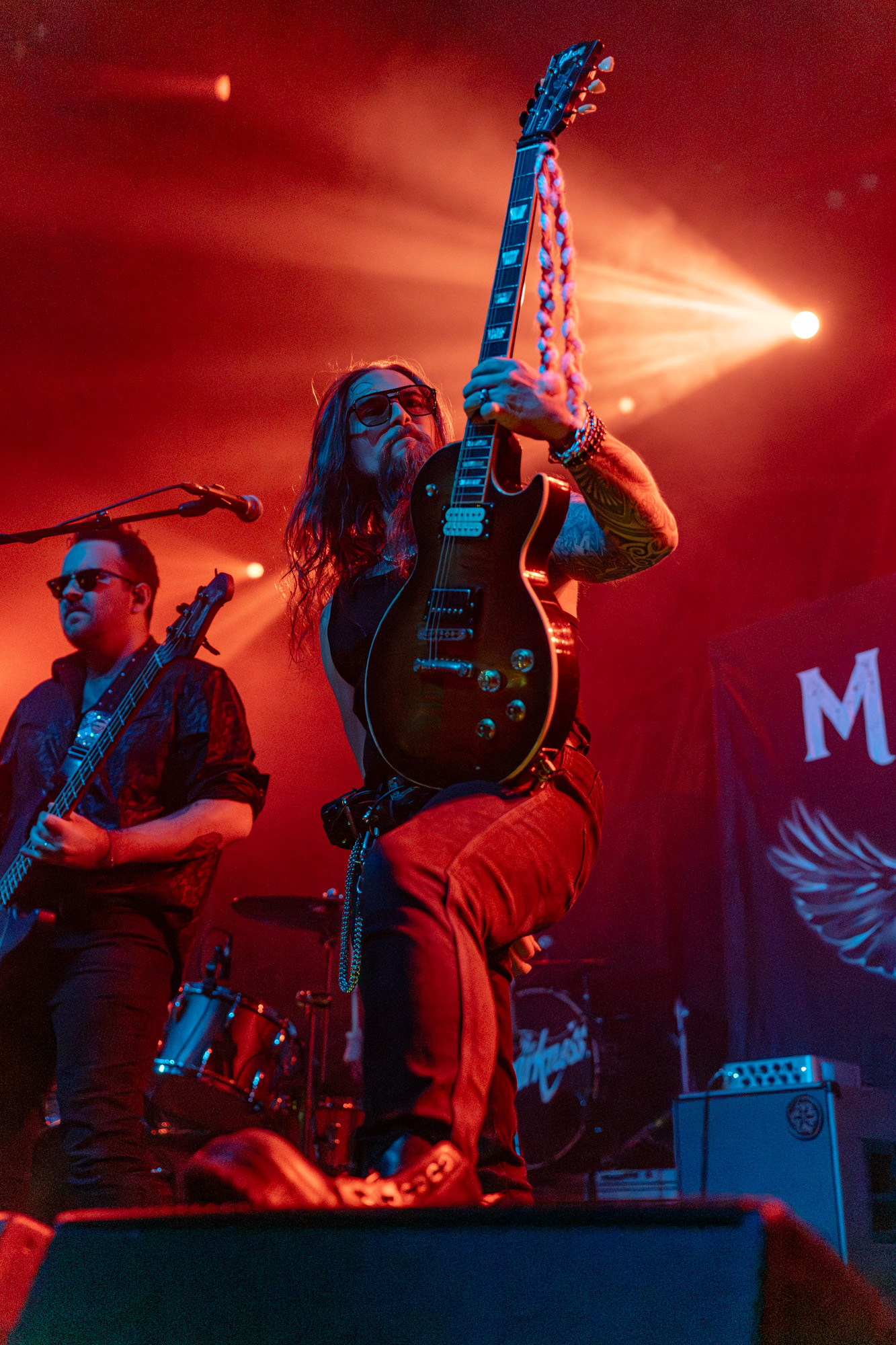 The set moved fast. The band’s chemistry was tight, their sound sharp and heavy without losing its playful edge. Justin worked the stage like it was home, cracking jokes, jumping on monitors, and pulling the crowd into every moment. His brother Dan kept the riffs tight while Frankie Poullain locked in on bass with effortless groove. Midway through, drummer Rufus Taylor dedicated a song to his son’s fifth birthday, and the entire crowd joined in for an off-key but heartfelt version of “Happy Birthday” that somehow fit the moment perfectly.