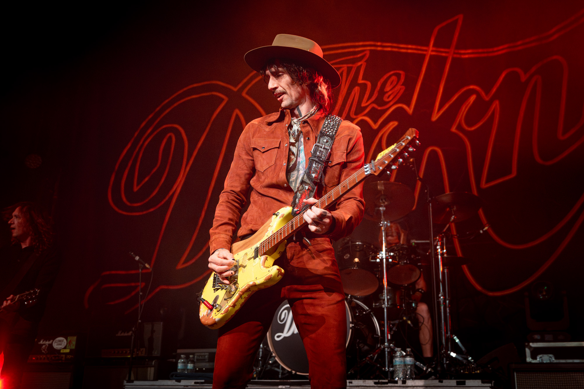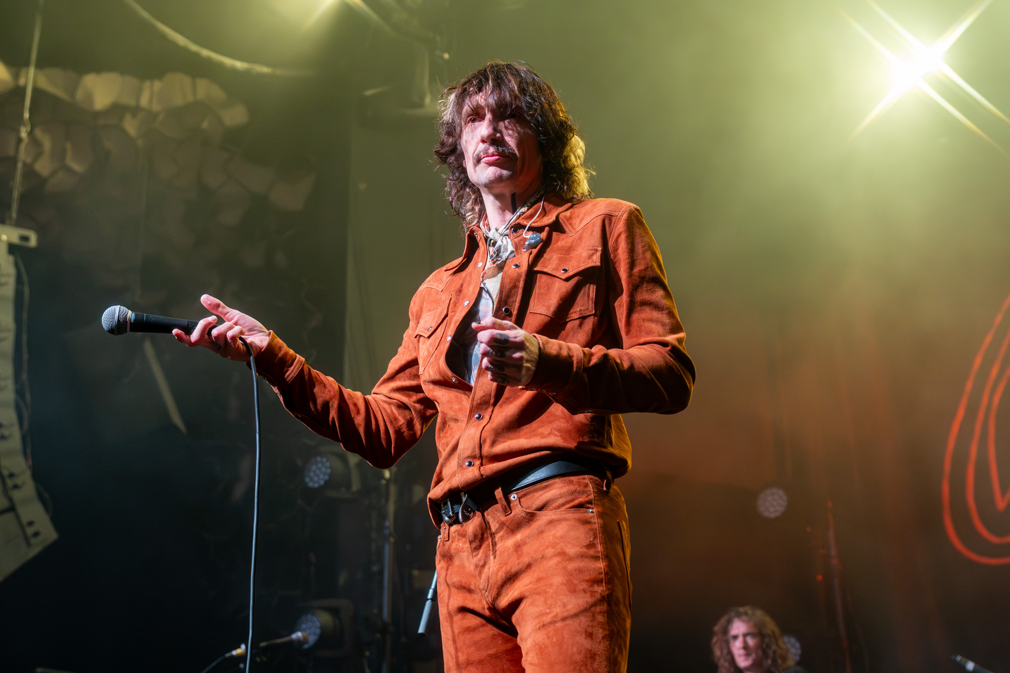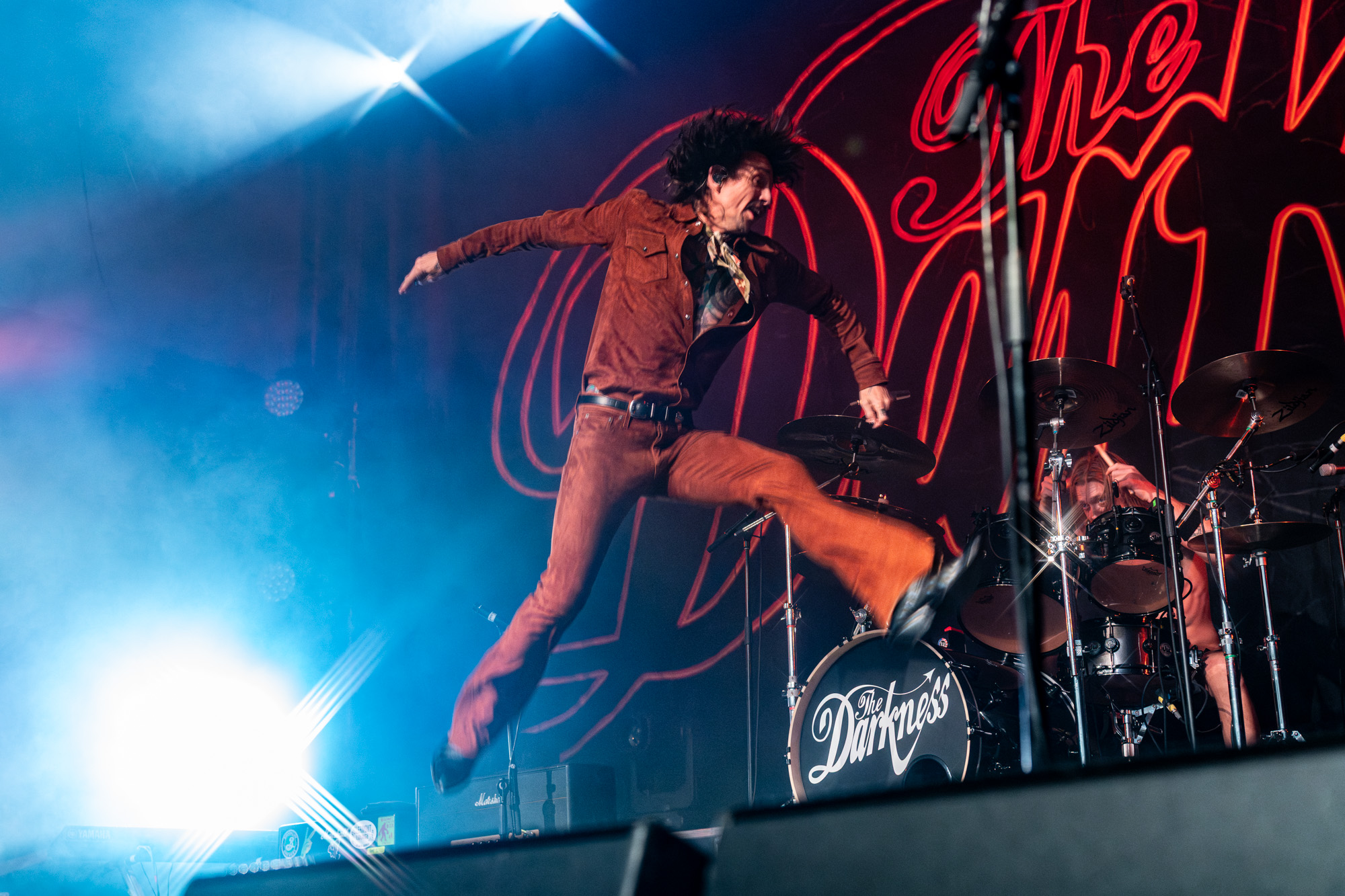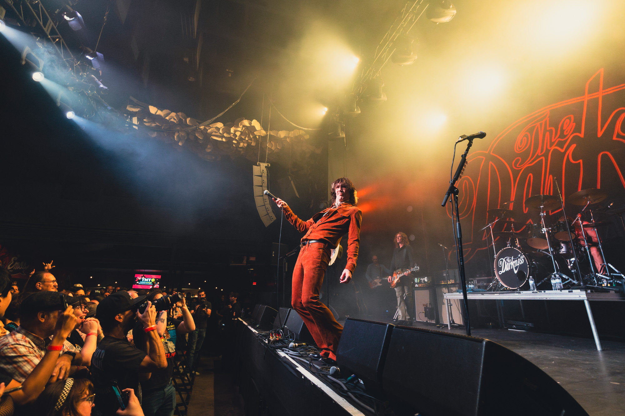 At 9:03 pm, the lights dropped and The Darkness exploded onto the stage with “Rock and Roll Party Cowboy.” Justin Hawkins appeared in a maroon velvet western-style top with matching pants and a brown wide-brimmed hat, looking every bit the glam rock cowboy Austin never knew it needed. The first notes hit, his falsetto soared, and the room erupted. You could feel how much people had missed this kind of show: loud, theatrical, and full of life.