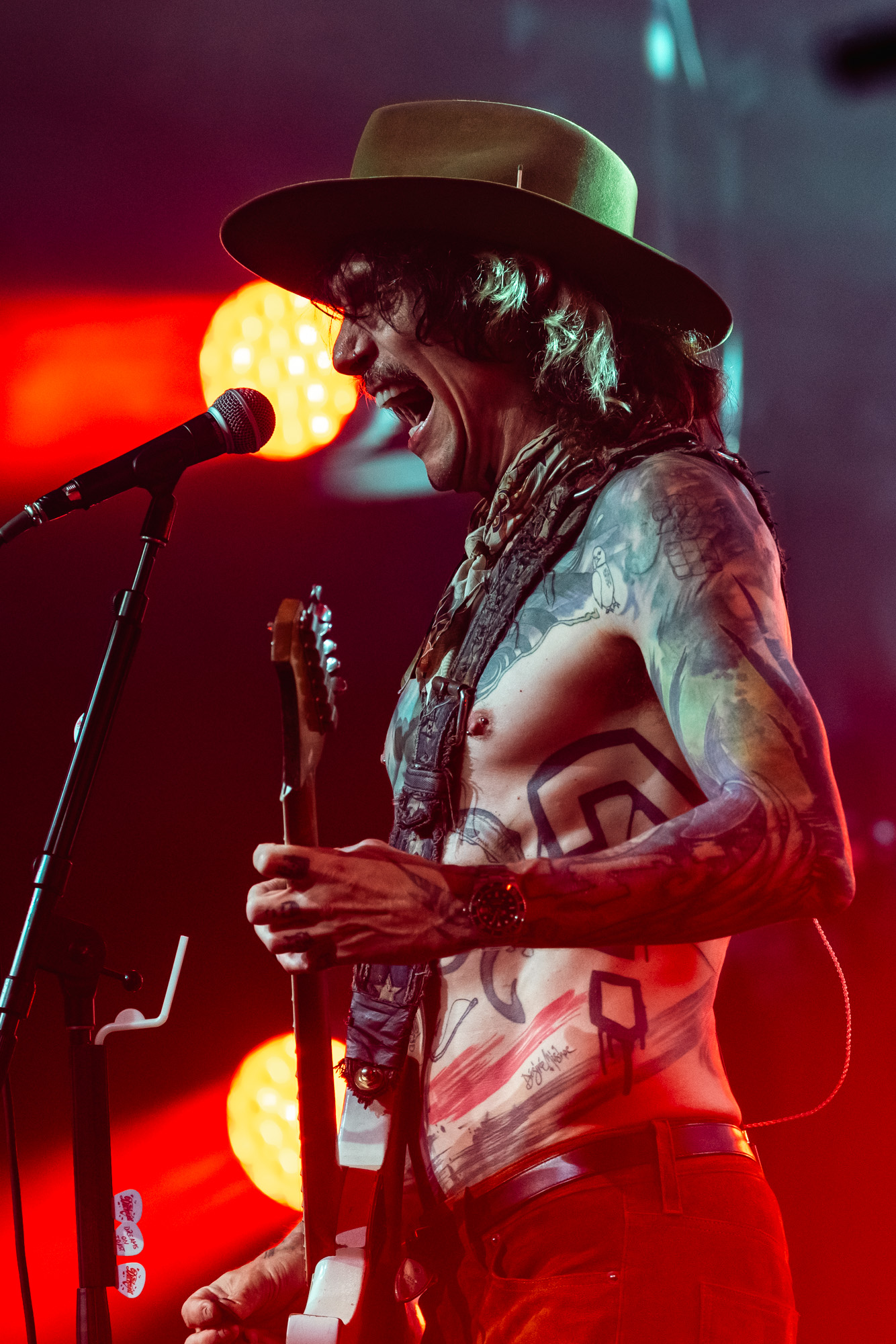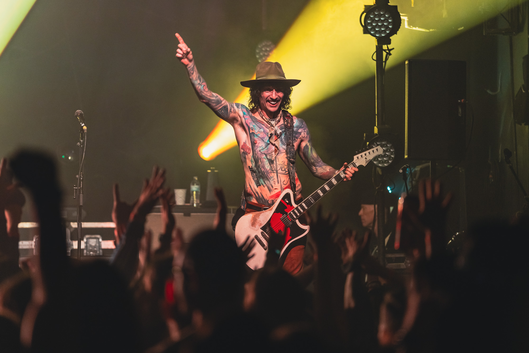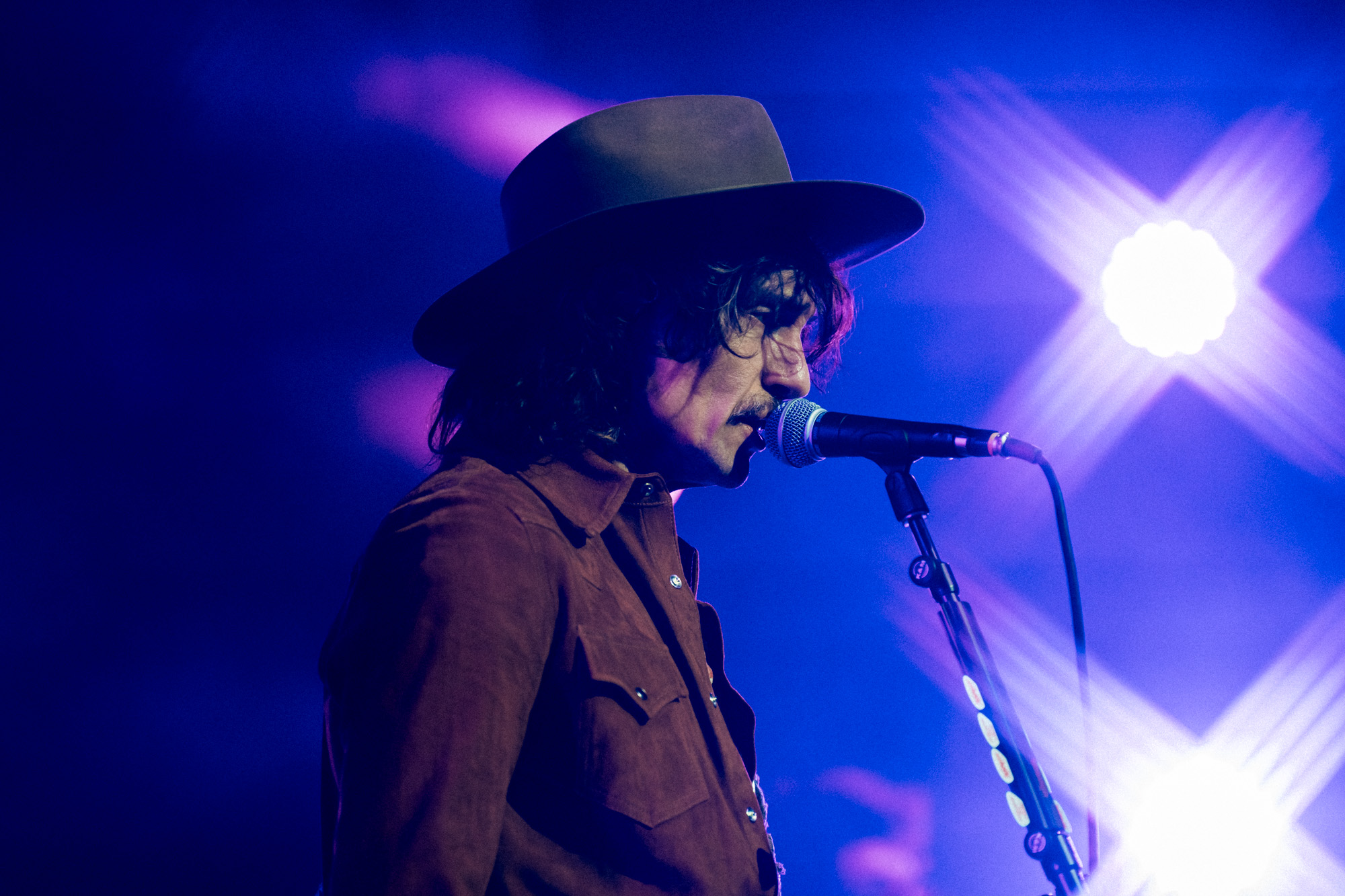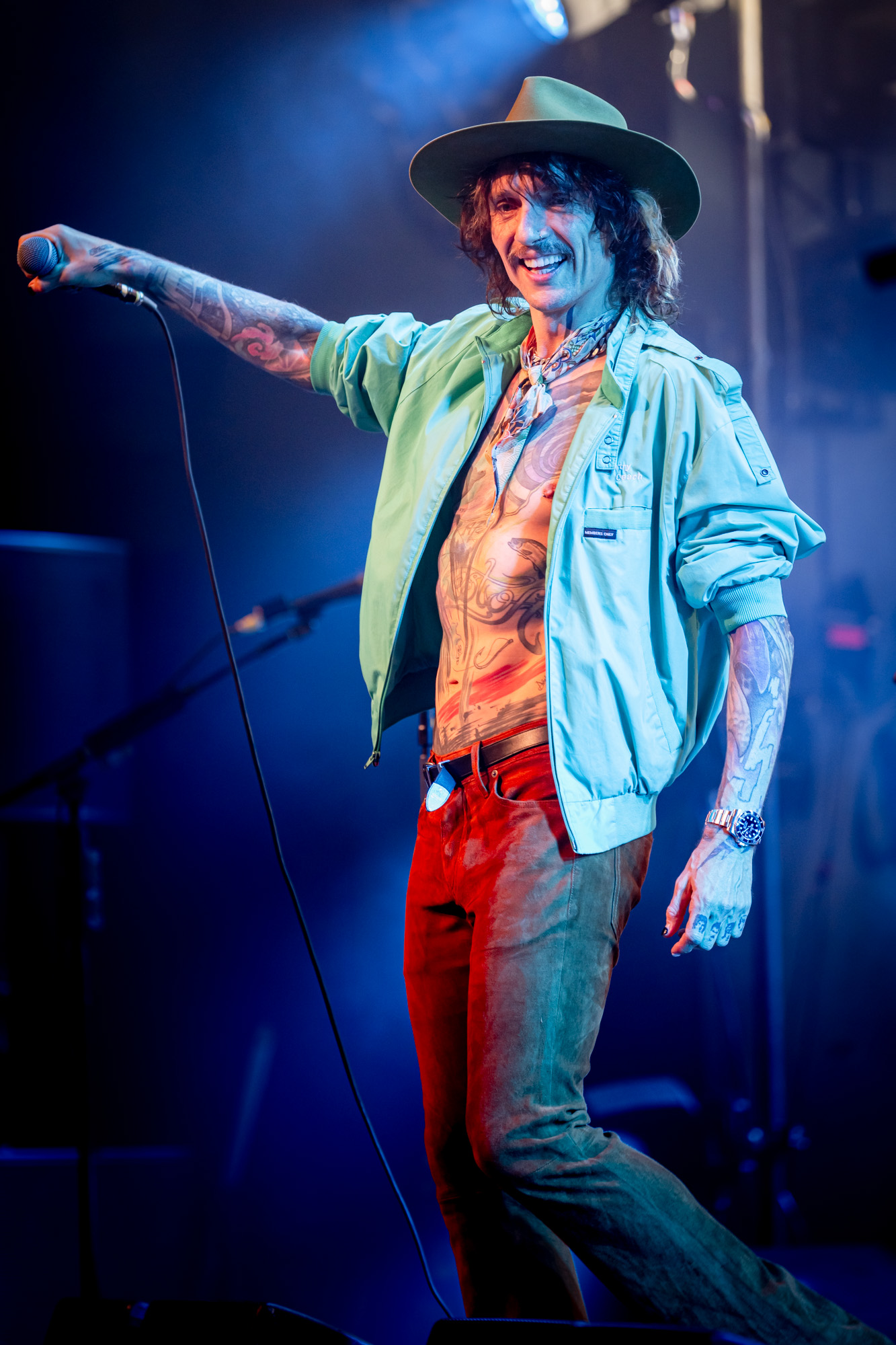 At 9:03 pm, the lights dropped and The Darkness exploded onto the stage with “Rock and Roll Party Cowboy.” Justin Hawkins appeared in a maroon velvet western-style top with matching pants and a brown wide-brimmed hat, looking every bit the glam rock cowboy Austin never knew it needed. The first notes hit, his falsetto soared, and the room erupted. You could feel how much people had missed this kind of show: loud, theatrical, and full of life.