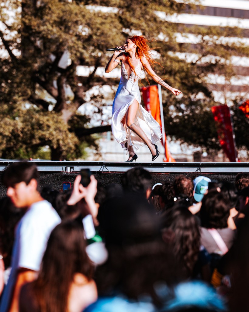 Jade LeMac shifted the emotional tone of the afternoon with a more personal performance. Wearing a white button up shirt and tie, she joked about the Texas heat before introducing what she called her favorite song she had ever written. The honesty in the performance pulled the crowd closer with every lyric.